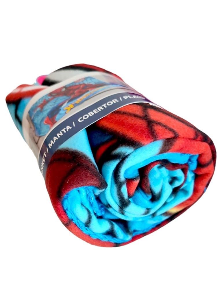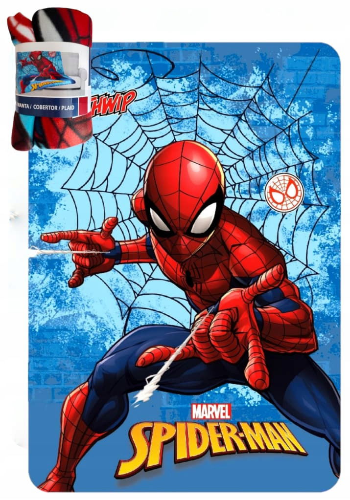 Dziecięcy kocyk z super-bohaterem Spiderman na niebieskim tle. to niezbędny element wyposażenia dziecięcego pokoju.
