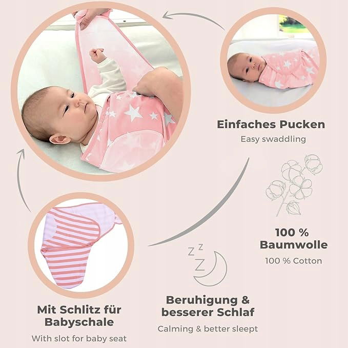 - Kojący i lepszy sen – idealny do pisania dla niemowląt – otulający koc symuluje bezpieczeństwo i ucisk w łonie matki. Arm puck zapobiega przebudzeniu się przez odruchy rzutów, drgań i przestraszenia.