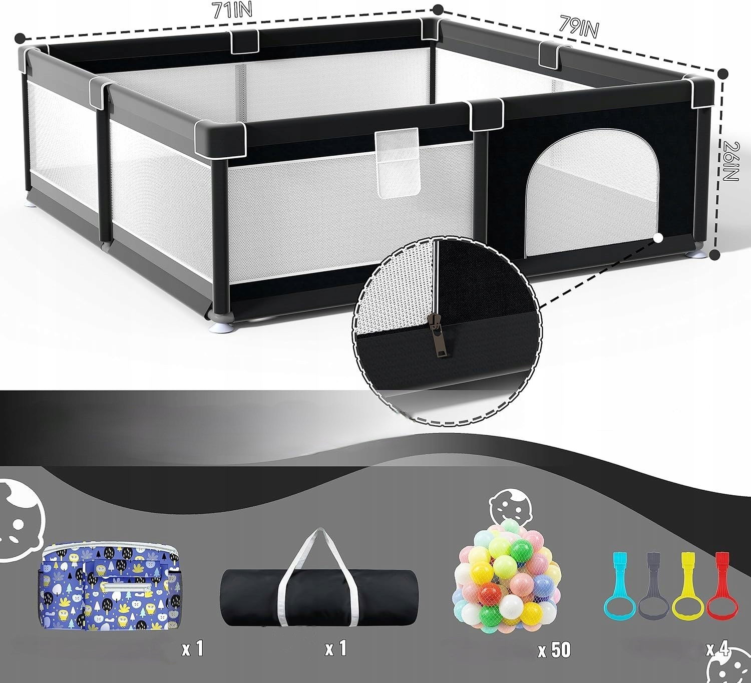 Kojec dla niemowląt XXL 200x180 cm, oddychająca siatka HEIZO czarny