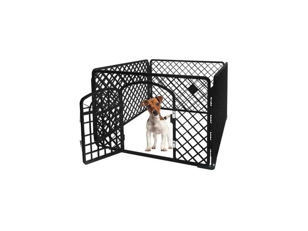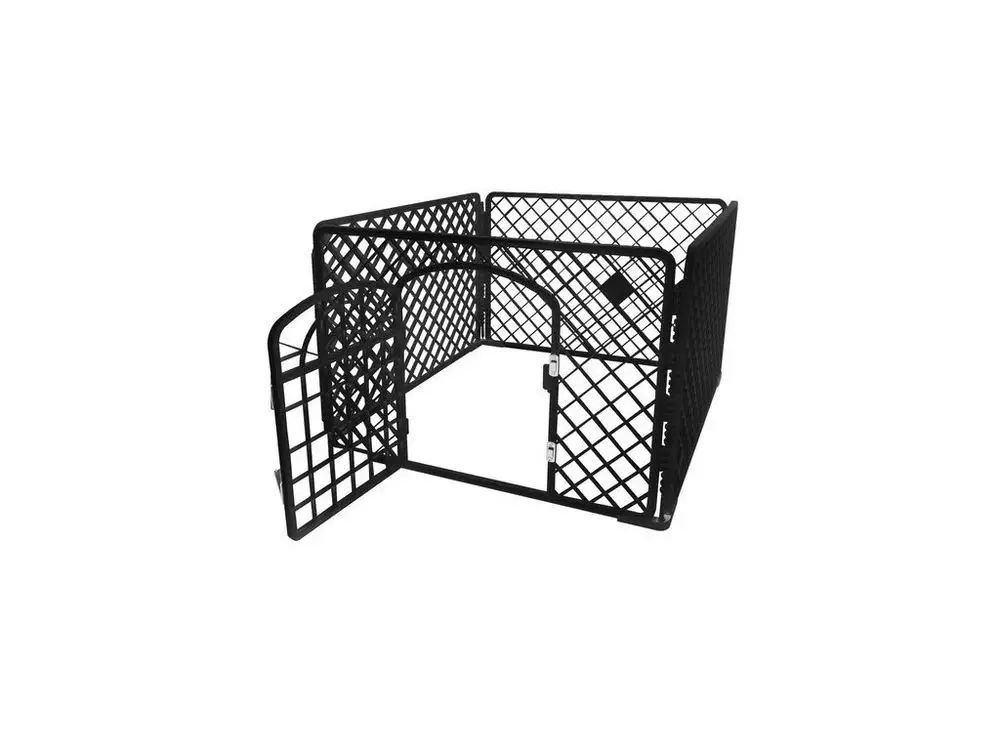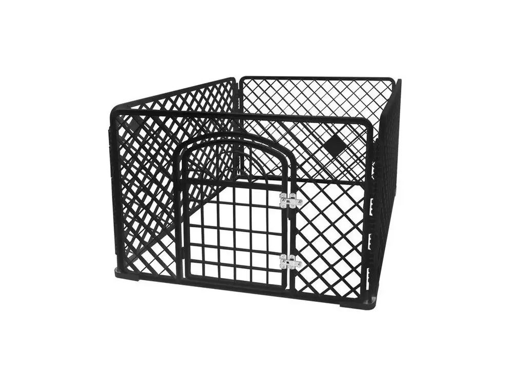 Klatka dla psa składa się z 4 ścianek. W jednej z nich znajduje się bramka, przez którą nasz pupil swobodnie może wejść do środka. Poszczególne ściany łączone są za pomocą specjalnych prętów, a bramka została solidnie i odpowiednio zabezpieczona, by skutecznie uniemożliwić jej otwarcie przez zwierzę.