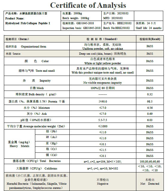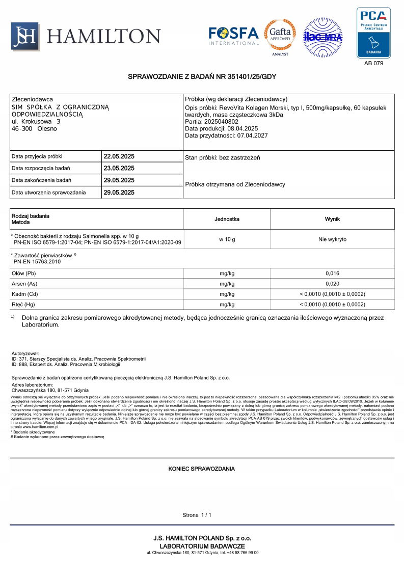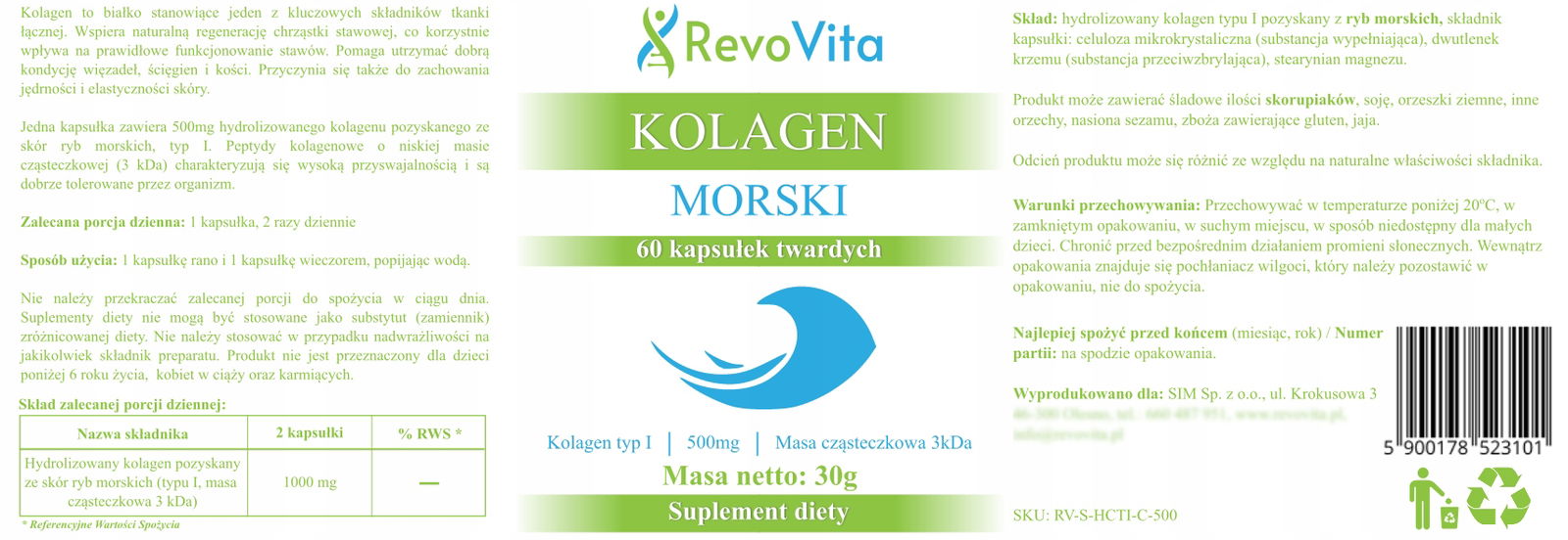 Jedna kapsułka zawiera 500mg hydrolizowanego kolagenu pozyskanego ze skór ryb morskich, typ I. Peptydy kolagenowe o niskiej masie cząsteczkowej (3 kDa) charakteryzują się wysoką przyswajalnością i są dobrze tolerowane przez organizm.