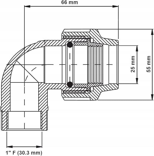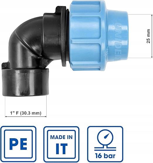 Złączki hydrauliczne do rur wodnych, 25 mm żeńskie x 1" ,kolanko żeńskie z tworzywa sztucznego 16 barów, maks. temp. 45°C, armatura z polietylenu MDPE