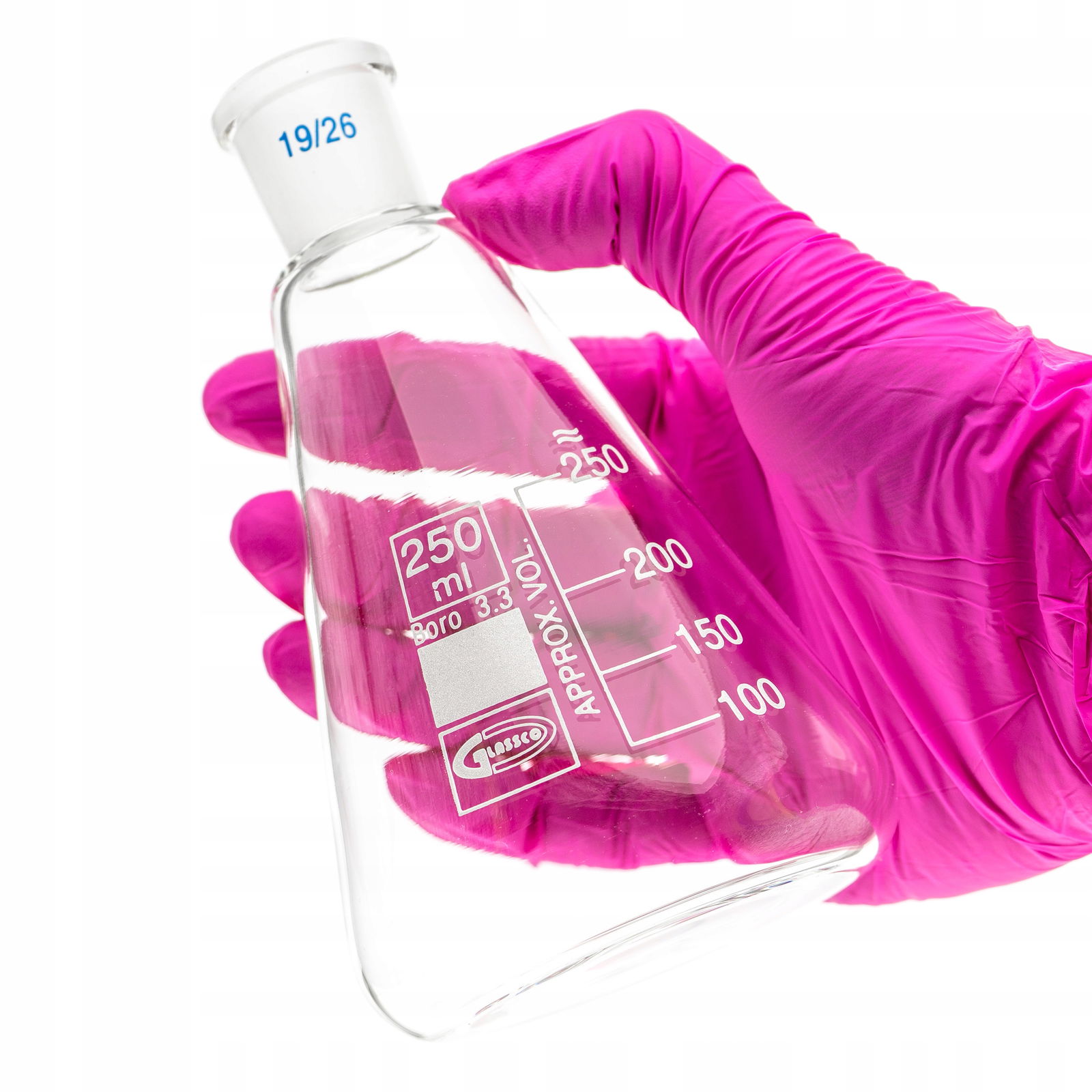 Szklana kolba stożkowa typu Erlenmeyera o pojemności 250 ml, wykonana z odpornego szkła borokrzemowego 3.3. Posiada wąską szyjkę zakończoną szlifem 19/26, białą skalę oraz pole opisowe. Zwiększona wytrzymałość mechaniczna dzięki wzmocnionemu obrzeżu. Produkt charakteryzuje się wysoką odpornością chemiczną i termiczną, dzięki czemu nadaje się do profesjonalnych zastosowań laboratoryjnych.