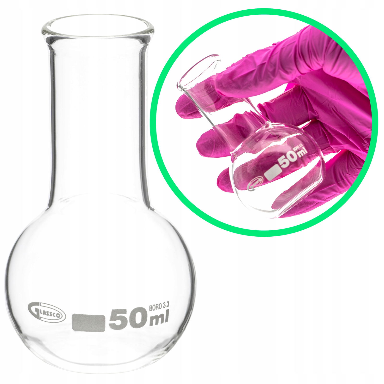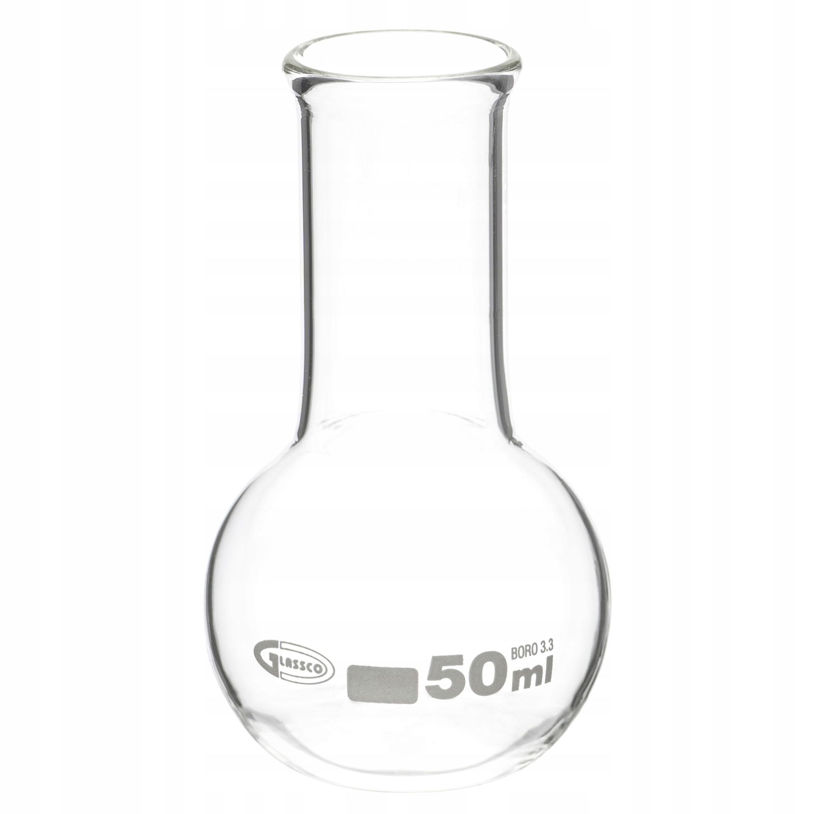 Kolba płaskodenna 50 ml szklana borokrzemowa 3.3 wąska szyjka wzmocniona