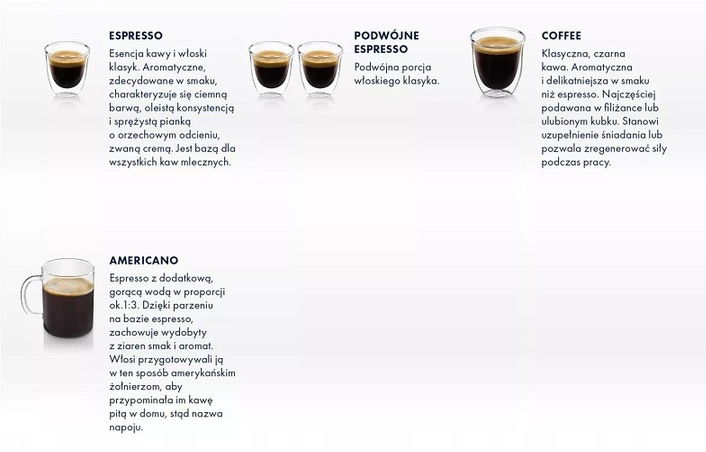 - La Specialista pozwala na przygotowanie Espresso, podwójnego Espresso, kawy czarnej oraz Americano.