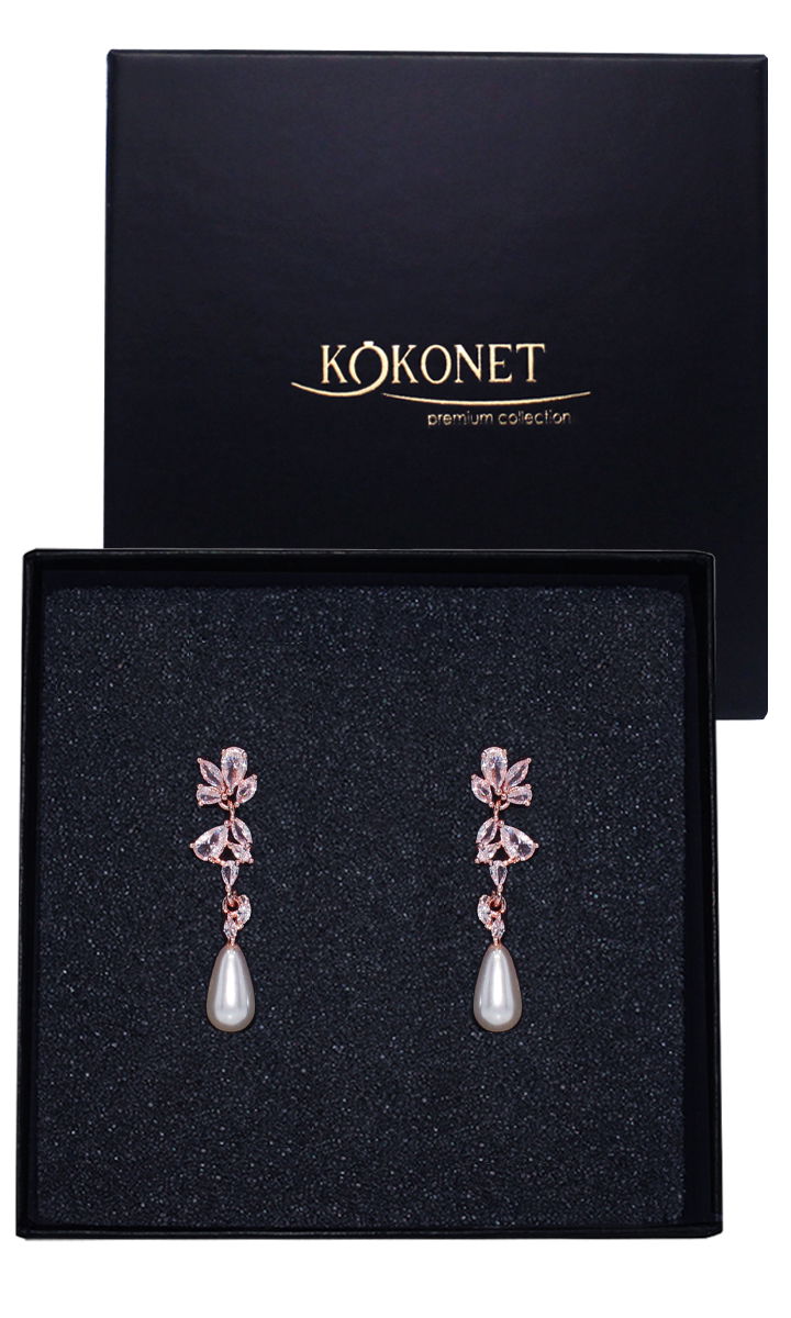 Ultra lekkie kolczyki ślubne z perłą i błyszczącymi cykoniami MARISEY w kolorze różowego złota będą idealnym uzupełnieniem eleganckiej koronkowej sukni, lub sukni ślubnej z motywem kwiatowym, a także gładkiej sukni ślubnej. Perełki syntetyczne użyte w tym modelu są puste w środku dzięki czemu kolczyk jest bardzo lekki zachowując ponadczasową elegancję.