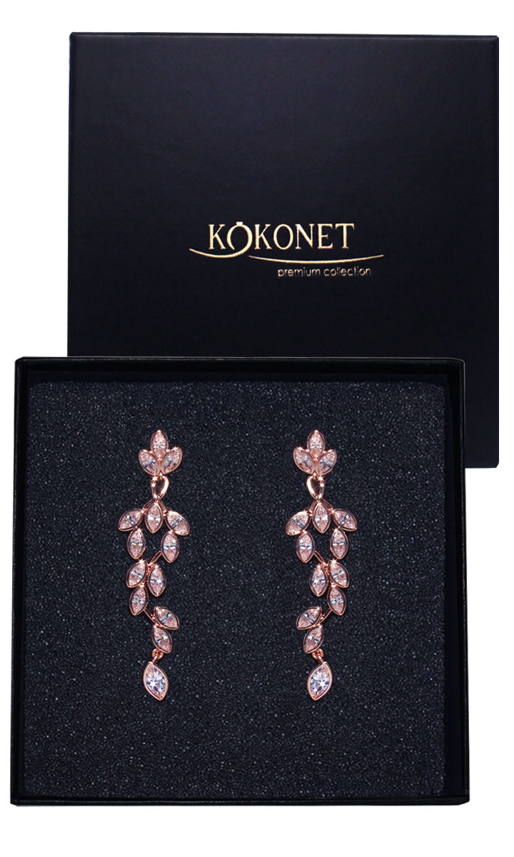 Projektując kolczyki ślubne NABLA w różowym złocie z listkami z cyrkonii chcieliśmy osiągnąć maksymalnie elegancki i równocześnie rustykalny design kolczyków, które będą mogły zostać założone zarówno do gładkich sukni ślubnych w stylu imperial, jak i do klasycznych koronek.