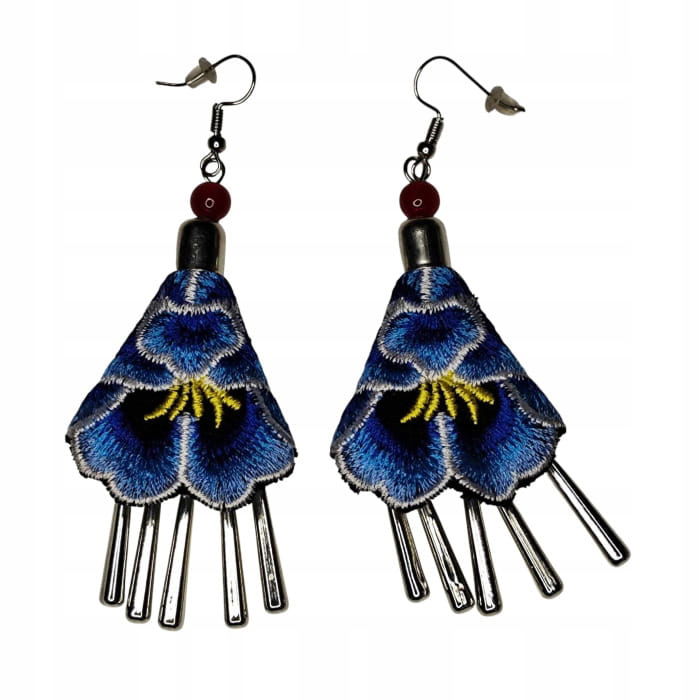 Motyw: Bratek – symbol pamięci, wierności i duszyKolorystyka: Błękit, granat i intensywna żółć, pięknie haftowane na głębokim tleMateriał: Bawełna z haftem + elementy metaloweDługość całkowita: 9 cm | Szerokość: 4,5 cm | Grubość: 0,5 cmWykończenie: Zamiast koralików – ruchome, srebrzyste rurki dla lekkiego, nowoczesnego efektu