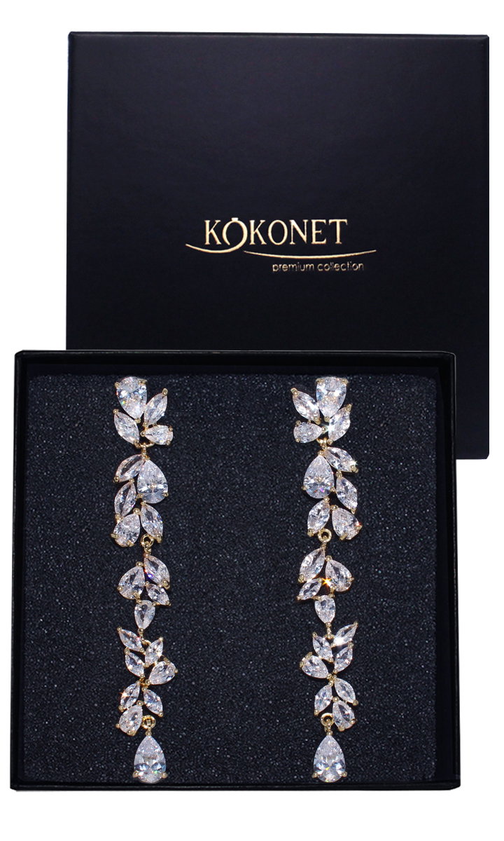 Kolczyki złote długie z listkami cyrkoniami ŚLUBNE eleganckie