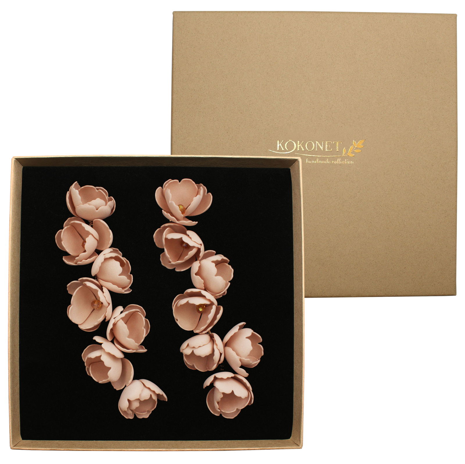 Długie kwiatowe kolczyki to obecnie gorący trend wśród dodatków. Kolczyki LIDIA powstały uosabiając marzenia o girlandach kwiatów zdobiących uszy. Kwiaty są delikatne i formowane ręcznie z pianki dzięki czemu każdy z nich jest całkowicie inny. Lekkie kwiatowe kolczyki w kolorze kawy z mlekiem w złotej oprawie stanowić będą ciekawy i nietuzinkowy biżuteryjny dodatek.