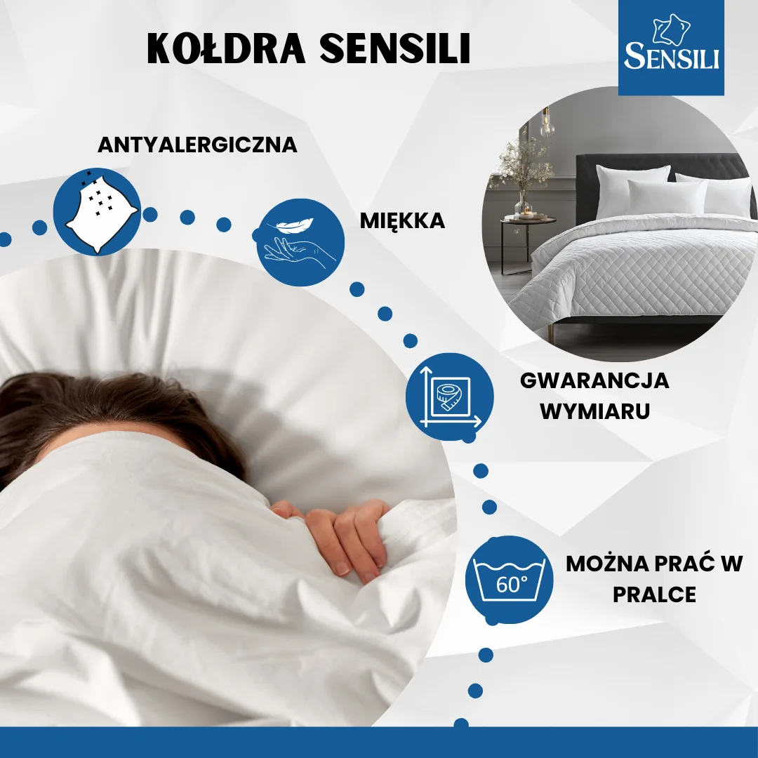 Kołdra antyalergiczna całoroczna 155×200 cm od polskiego producenta Sensili to idealny wybór na ciepłe noce. Dzięki poszyciu z miękkiej i przyjaznej dla skóry mikrofibry oraz hipoalergicznemu wypełnieniu z włókna silikonowego (HCS), zapewnia komfort snu, optymalną cyrkulację powietrza i ochronę przed alergenami. Jej lekka konstrukcja sprawia, że doskonale sprawdza się latem, gwarantując przyjemny chłód i zapobiegając przegrzewaniu. Produkt został starannie wykonany w Polsce, co jest gwarancją wysokiej jakości i dbałości o detale. Kołdra jest nie tylko wygodna, ale także łatwa w pielęgnacji, co czyni ją idealnym rozwiązaniem na długie lata.