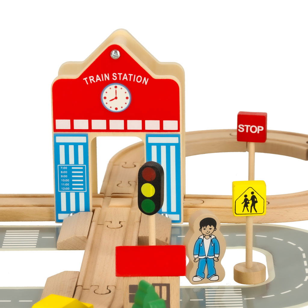 Oprócz torów, w zestawie znajdują się również pociąg z wagonem, samochód, budynki, figurki i dekoracje miasta, które można ustawić w dowolny sposób, tworząc własne miasteczko.