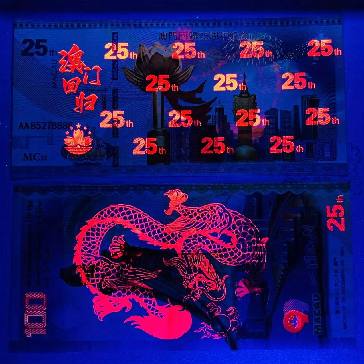 - Napisy "In Commemoration Of The Return Of Macau To China For 25 Years" oraz daty w języku chińskim i angielskim: "20 DE DEZEMBRO DE 2024".