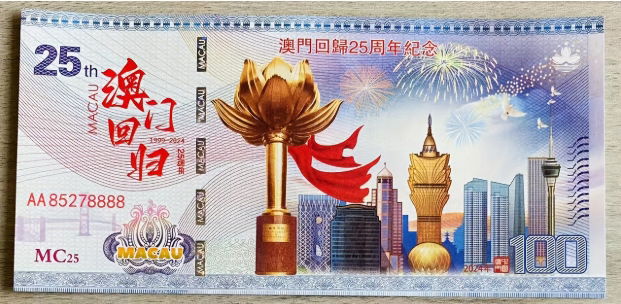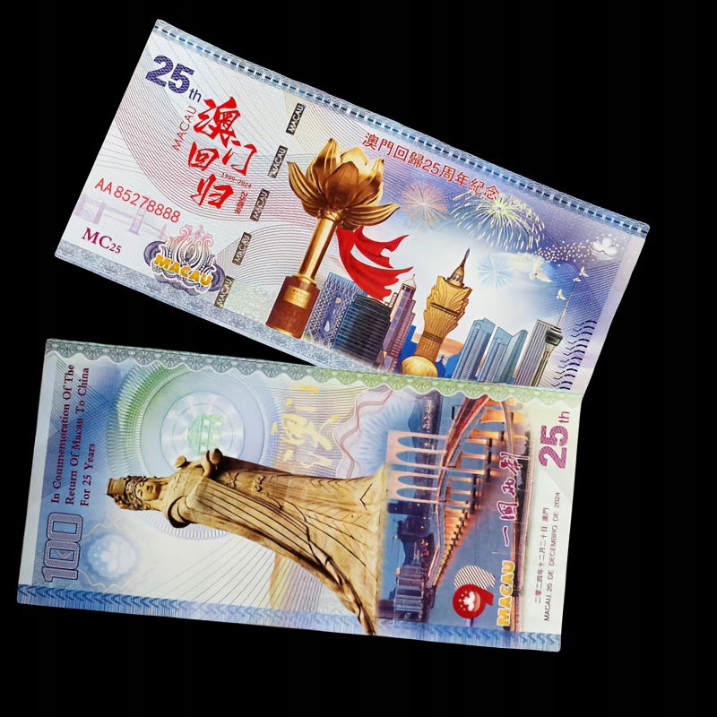 Na sprzedaż oferuję przepiękny i unikatowy banknot pamiątkowy o nominale 100 Pataca, wyemitowany z okazji 25. Rocznicy Powrotu Makau do Chin (1999-2024). Jest to doskonała gratka dla kolekcjonerów banknotów, pamiątek z Makau, czy też osób szukających nietypowego prezentu.