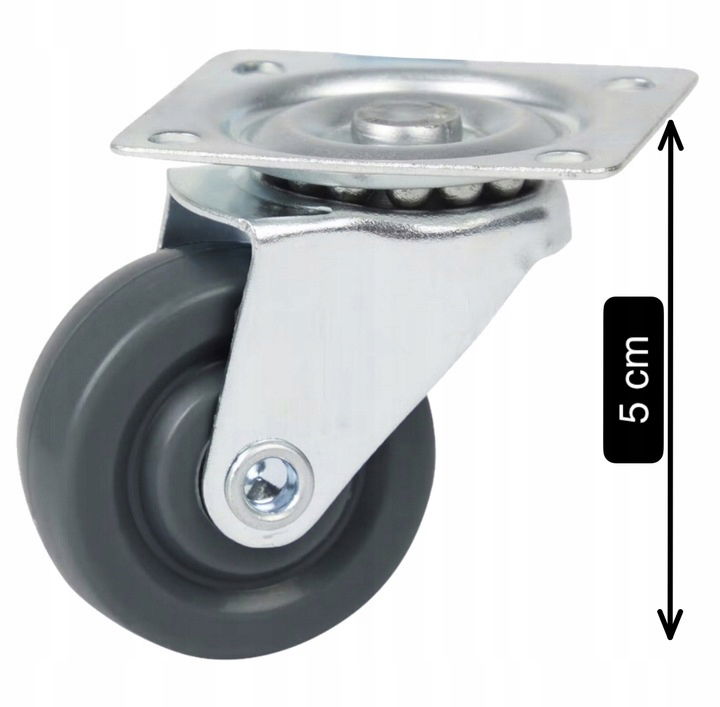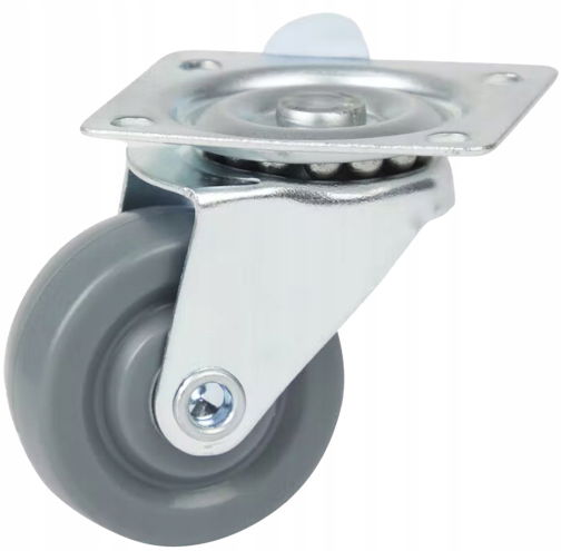 Kółka meblowe mocowane na płytkę są połączeniem widelca aparaturowego wykonanego ze stali ocynkowanej oraz koła polipropylenowego z szarym bieżnikiem z gumy termoplastycznej (TPE) niebrudzącej.