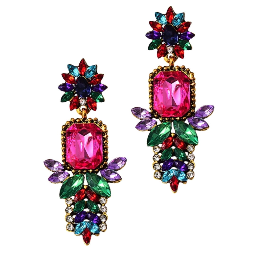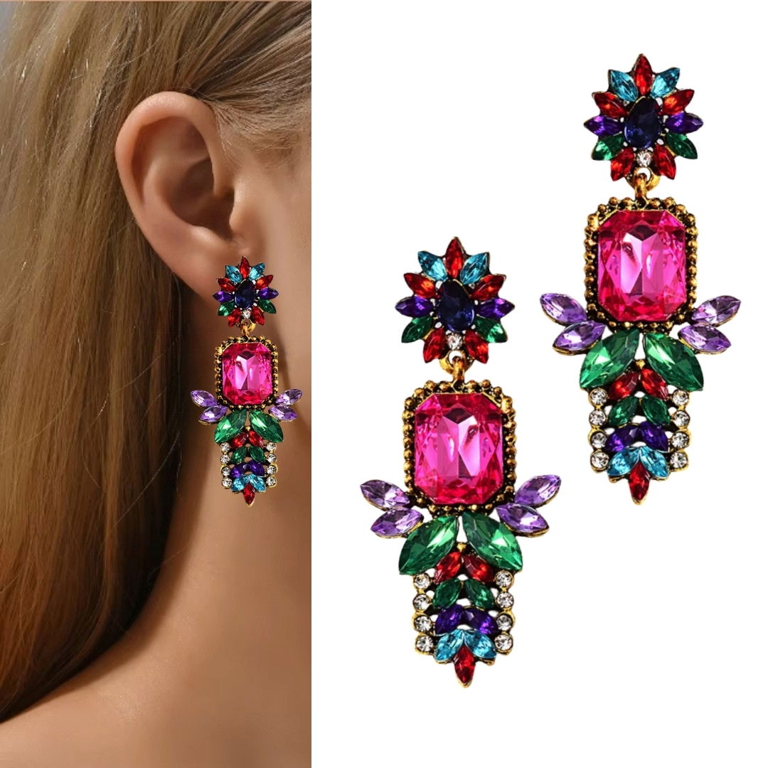 Kolorowe kolczyki FUKSJA zielony czerwień złote listki cyrkonie lekkie