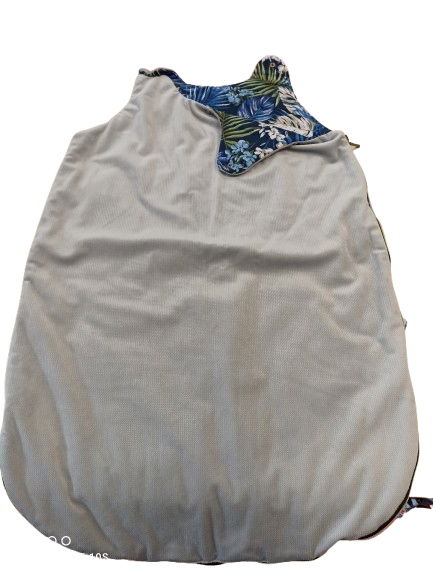 Śpiworek niemowlęcy w kolorze szarym. Wnętrze w zielone, niebieskie i białe liście oraz niebieskie i białe kwiatki. Dodatkowo znajdują się na nim niebieskie papugi. Oba ramionka zapinane na napy. Dodatkowo cały śpiworek zapinany na zamek.