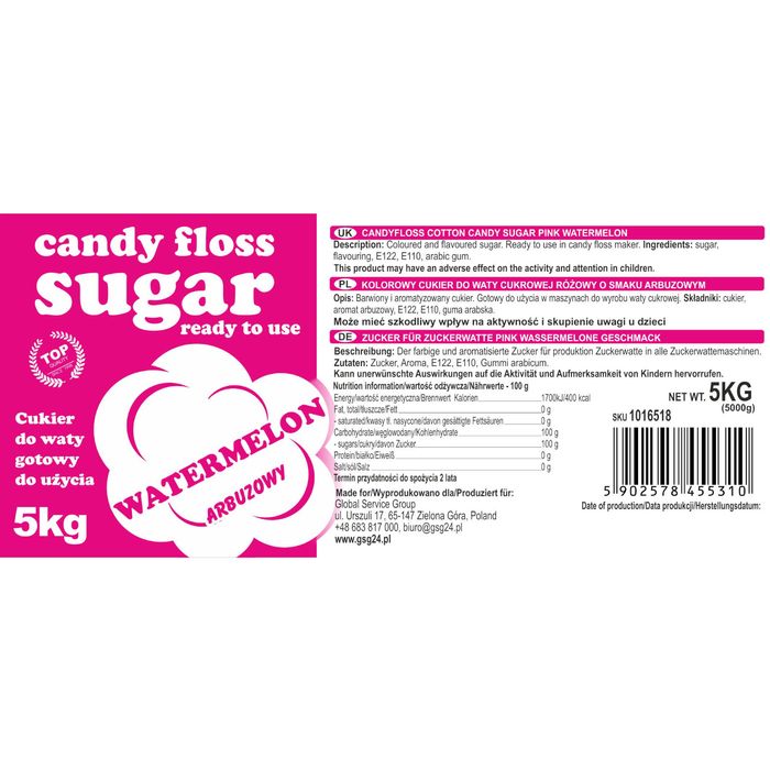 Kolorowy cukier do waty cukrowej czerwony o smaku arbuzowym 5kg
