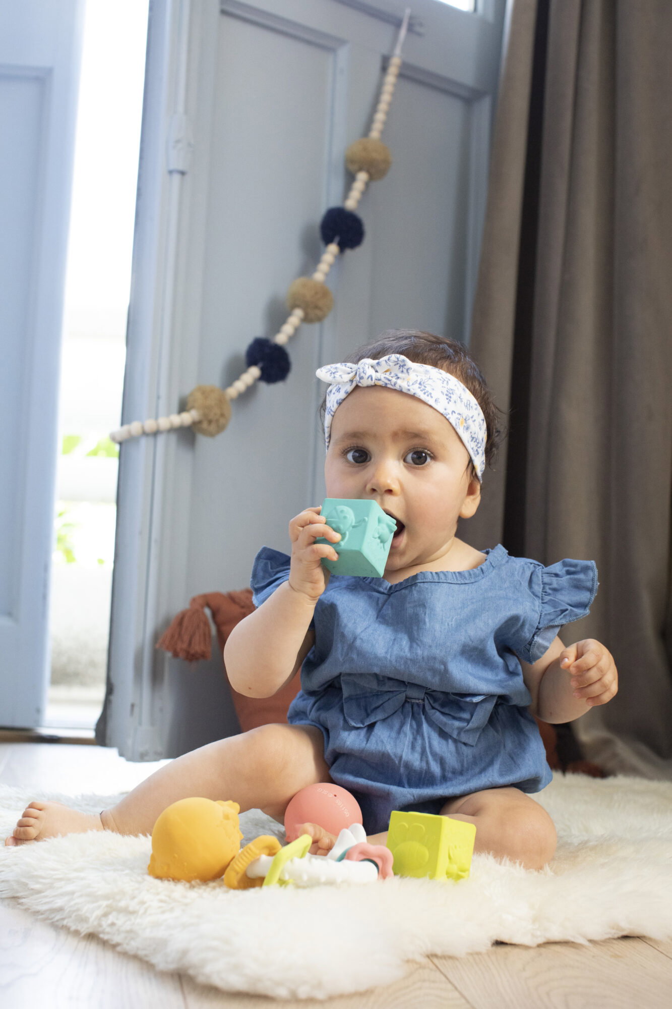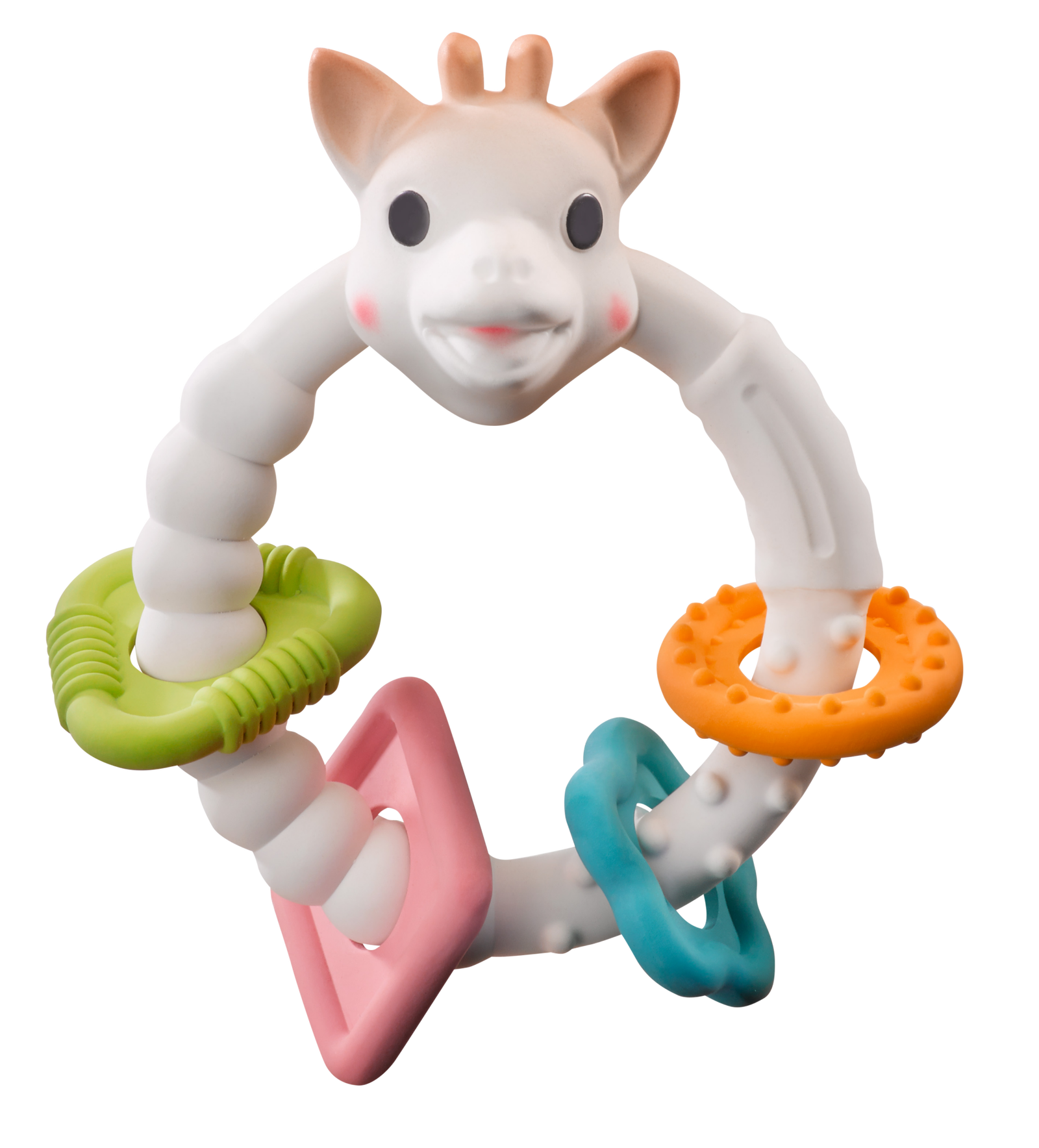 - kolorowy gryzak na kółku wykonany z naturalnego kauczuku. Naturalne tworzywo jest bezpieczne do żucia, lekkie i elastyczne, co chroni przed bolesnymi urazami podczas machania. Obłe kształty są łatwe do uchwycenia dla małej rączki, a różna tekstura (kropki i prążki) pozwala ukoić swędzące dziąsła w trakcie ząbkowania. Barwiony farbami spożywczymi. Wiele różnych części do żucia o różnej fakturze ma doskonałe właściwości masujące i kojące obolałe ząbkowaniem dziąsła. Cztery kolorowe, geometryczne elementy nanizane na kółko przyciągają oczy maluszka i rozwijają małą motorykę rączki.