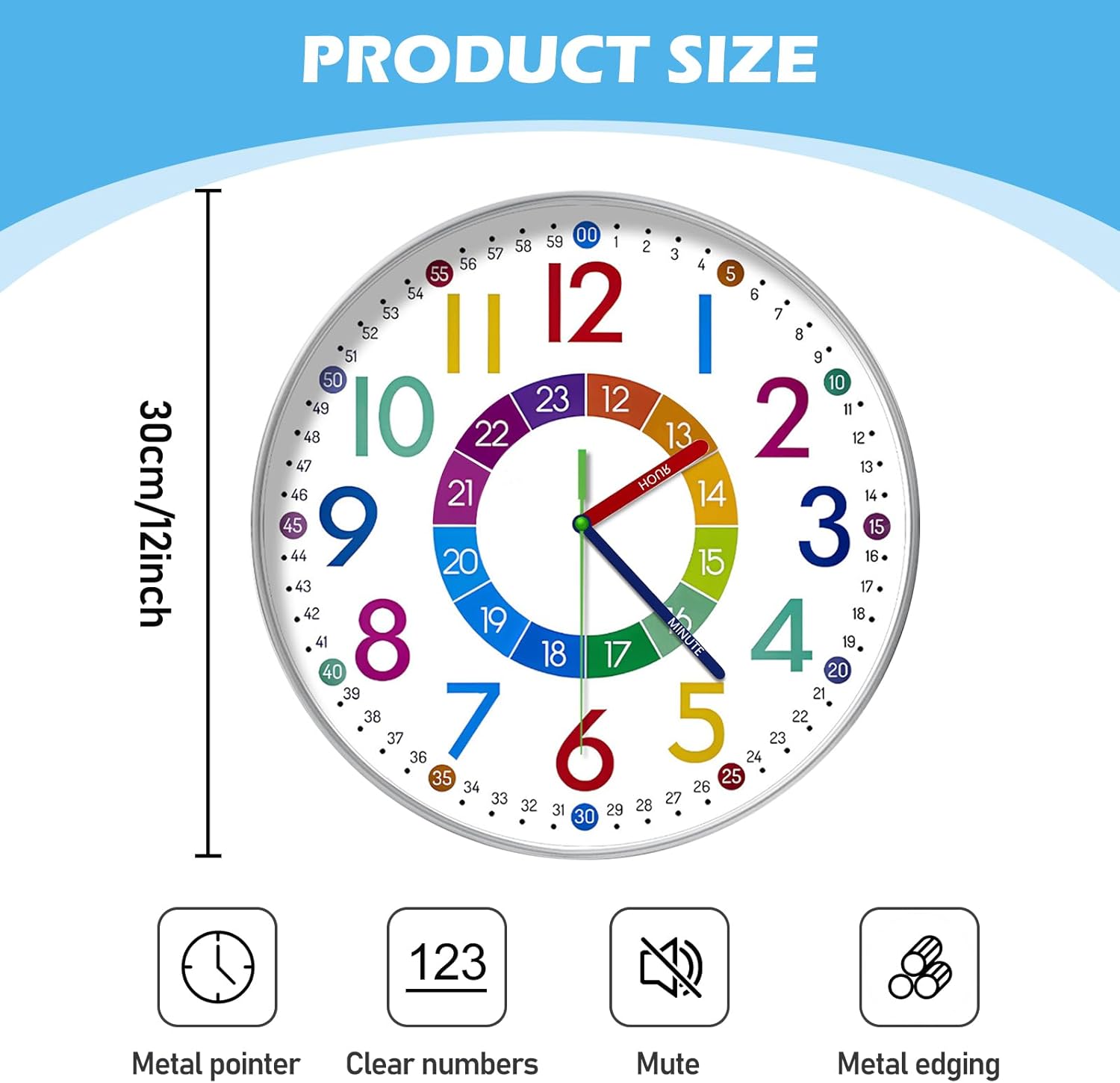 ✅ Zegar ścienny dla dzieci o średnicy 30 cm i dużych kolorowych cyfrach, zegar jest łatwy do odczytania i idealny do pokoi dziecięcych i szkół.