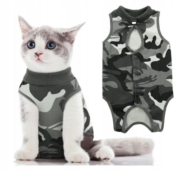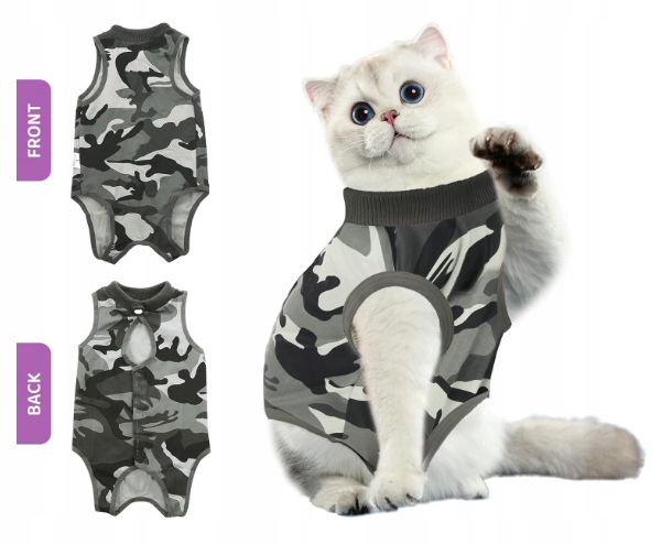 Wysoka elastyczność i bez rękawów zapewniają większy zakres ruchu. Z tyłu znajduje się kilka wzorów zapinanych na guziki. Łatwe wkładanie i wyjmowanie, kot może się swobodnie poruszać, co ułatwia opiekę nad zwierzętami.