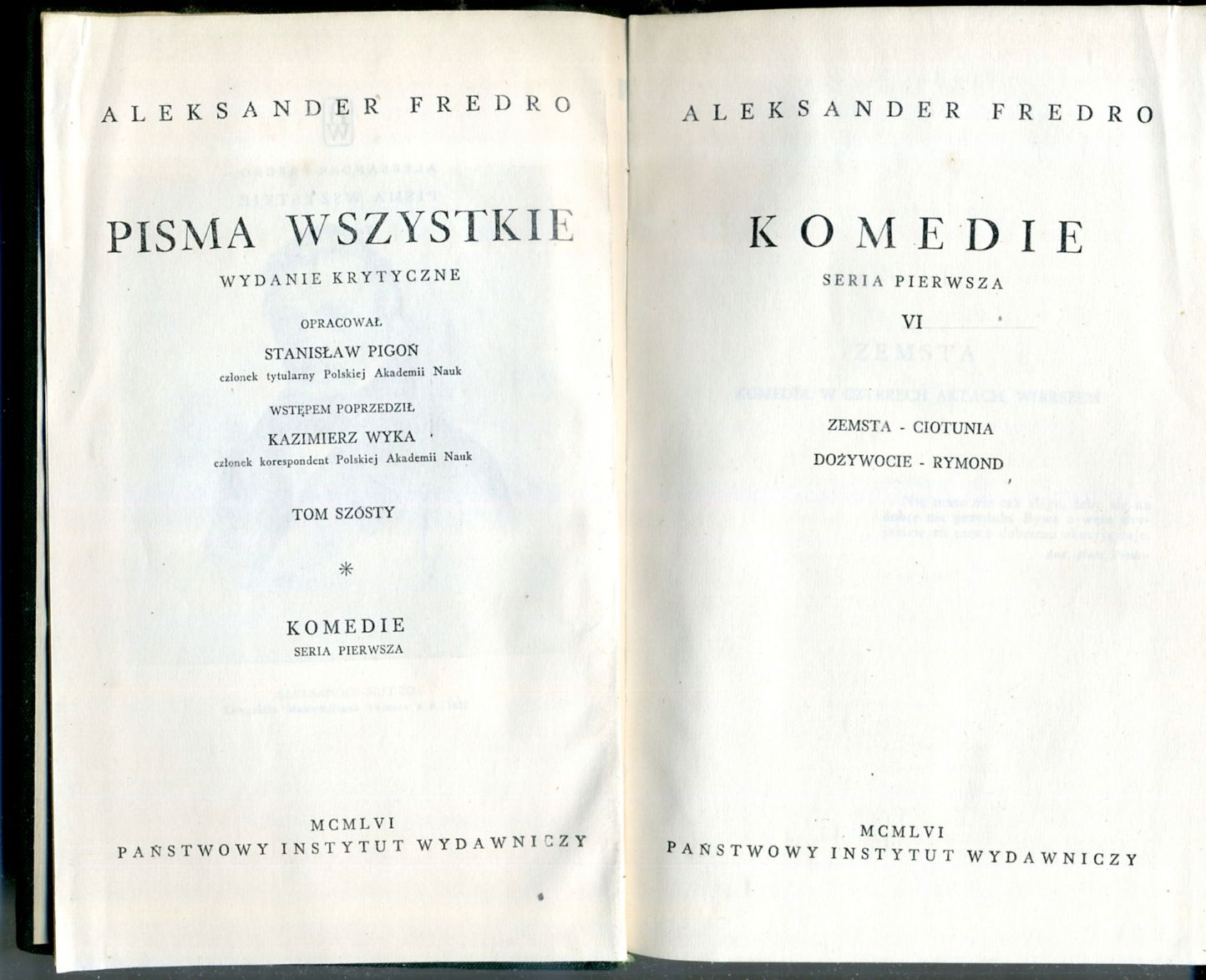 • Fredro Pisma wszystkie Komedie Zemsta, Ciotunia, Dożywocie, Rymont (1956)