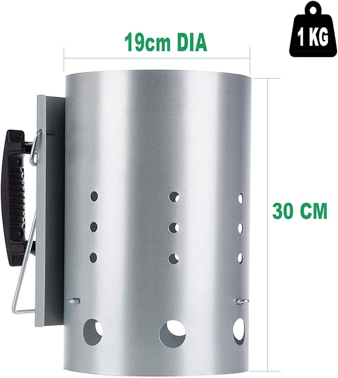 - Wymiary: 30 cm wysokości x 19 cm średnicy, mieści wystarczającą ilość brykietów do grilla o średnicy 57 cm