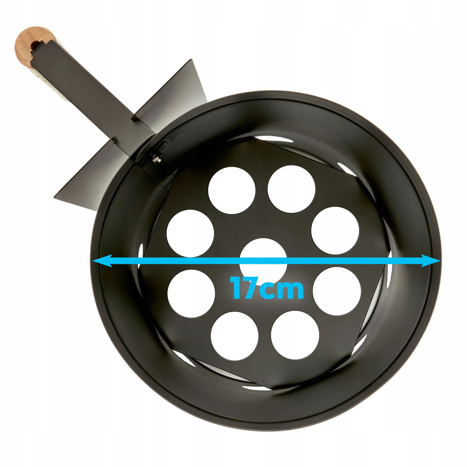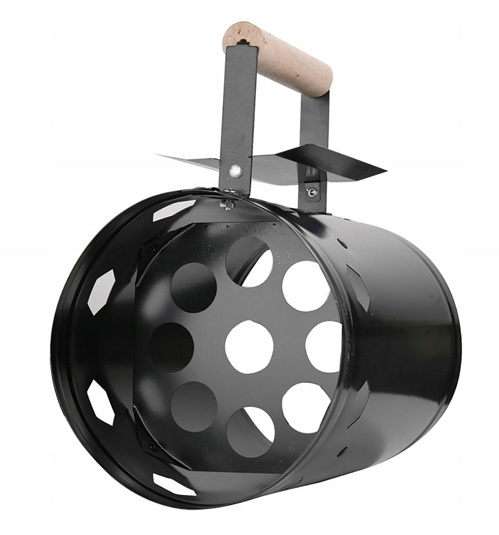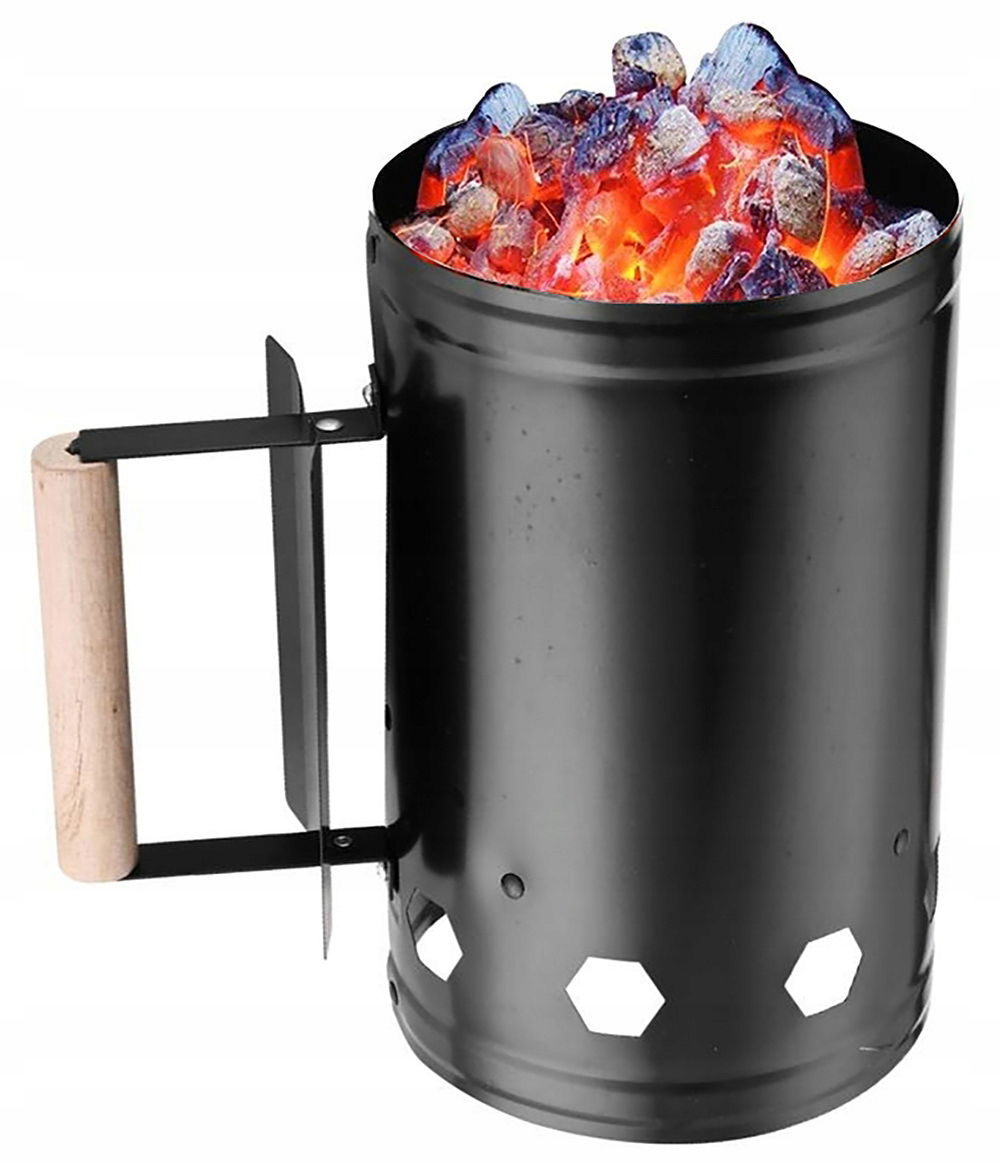 Nowy, komin do rozpalania węgla, brykietu na grilla. Skuteczny sposób na szybkie i łatwe rozpalenie grilla. Urządzenie zwiększa Twoje bezpieczeństwo - nie musisz stosować sztucznych podpałek, które zmieniają smak potraw i zawierają szkodliwe substancje chemiczne. Komin posiada specjalne otwory wentylacyjne, zapewniające idealny przepływ powietrza. Idealnie wyprofilowana drewniana rączka chroni przed poparzeniem po nagrzaniu komina.