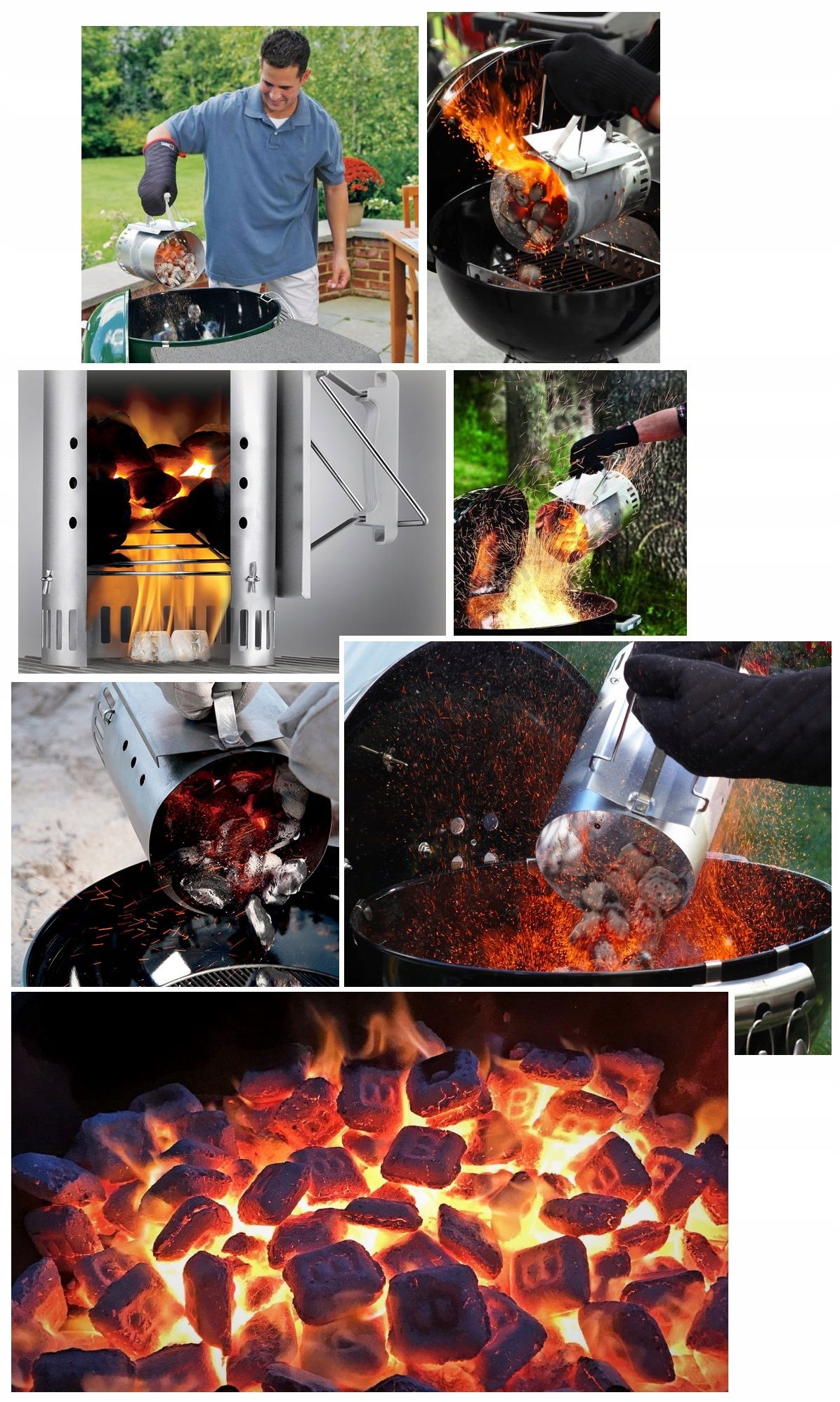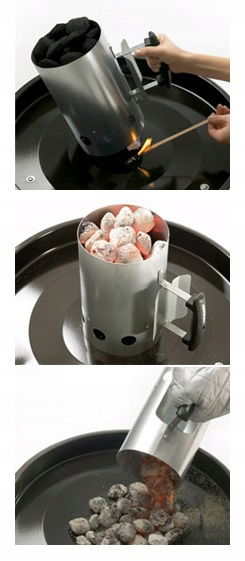 W celu użycia: komin od góry wypełnij brykietem. W dolnej części umieść papier bądź rozpałkę, podpal je i odczekaj do rozżarzenia węgli, a następnie wysyp je na palenisko grilla/wędzarni. Konstrukcję należy umieścić na niepalnym, stabilnym, płaskim podłożu na świeżym powietrzu (np. na ruszcie od grilla).