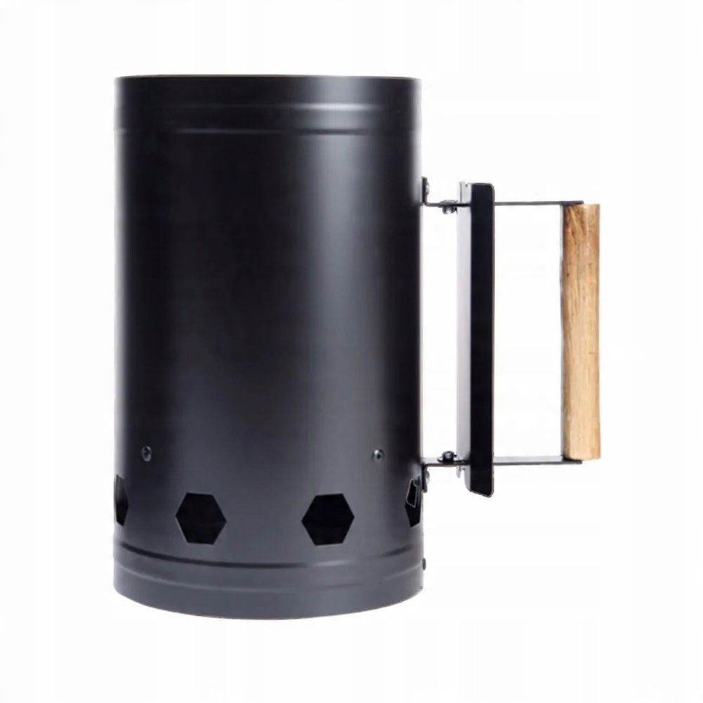 Nowy, komin do rozpalania węgla, brykietu na grilla. Skuteczny sposób na szybkie i łatwe rozpalenie grilla. Urządzenie zwiększa Twoje bezpieczeństwo - nie musisz stosować sztucznych podpałek, które zmieniają smak potraw i zawierają szkodliwe substancje chemiczne. Komin posiada specjalne otwory wentylacyjne, zapewniające idealny przepływ powietrza. Idealnie wyprofilowana drewniana rączka chroni przed poparzeniem po nagrzaniu komina.