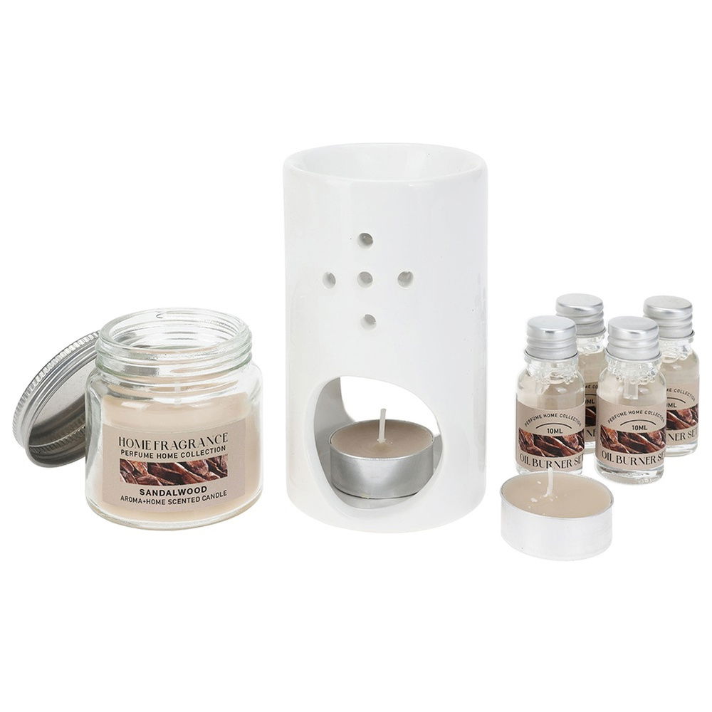 Kompletny zestaw do aromaterapii - Zestaw składający się z: kominka zapachowego z ceramiki, kominek ma wymiary 7 x 12,5 cm, czterech olejków zapachowych po 10 ml o zapachu drzewa sandałowego, dwóch zapachowych podgrzewaczy typu tealight oraz jednej świecy zapachowej w szklanym słoiku o wymiarach 6x6,5 cm.