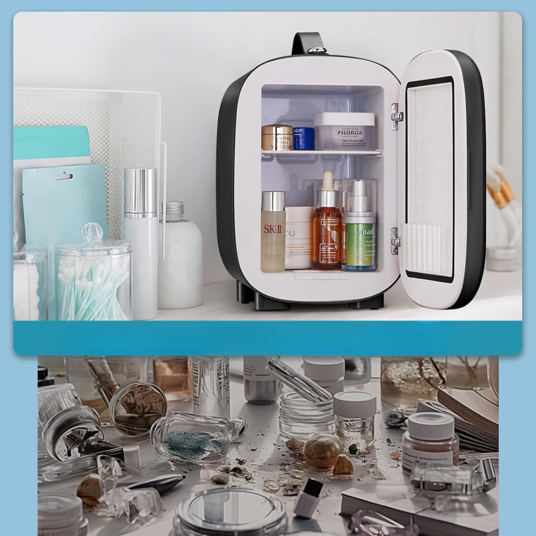 - Pojemność: mini lodówka o pojemności 5 litrów, z wymiarami wewnętrznymi 20 cm x 13,5 cm x 15 cm, pomieści do 6 puszek o pojemności 330 ml. Wyposażona w wyjmowaną półkę, która umożliwia wygodne oddzielanie napojów, przekąsek oraz produktów do pielęgnacji skóry i urody.