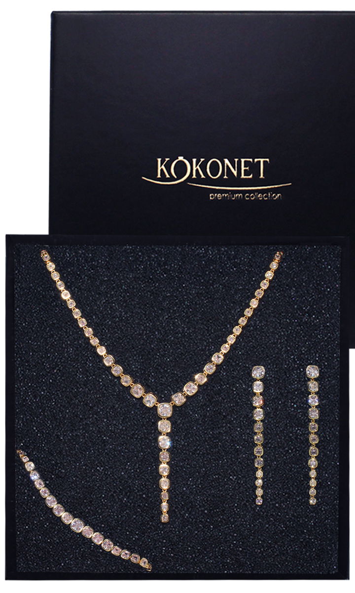 Elegancki i bardzo efektowny zestaw złotej biżuterii ślubnej składający się z kolii, długich kolczyków i bransoletki. Geometryczne kształty cyrkonii oprawianych obwodowo połączone w wysmuklające formy pięknie błyszczą ozdabiając ślubną stylizację i podkreślając jej wyjątkowy charakter. Wybierz go, jeśli szukasz oszałamiającej ale przy tym maksymalnie eleganckiej biżuterii.