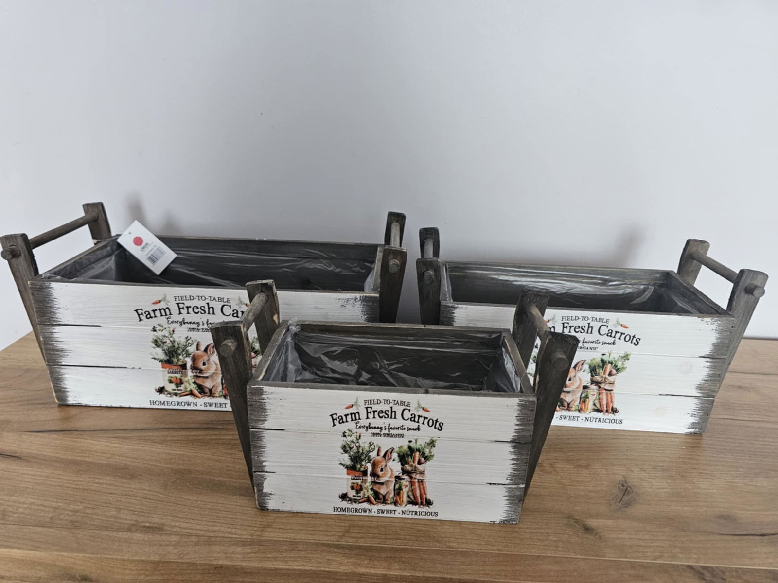 Komplet 3 osłonek drewnianych z motywem wielkanocnym.Wymiary: 17x37x16,5cm /16x31x13,5cm /15,5x25x11cm.Isłonki są nowe.