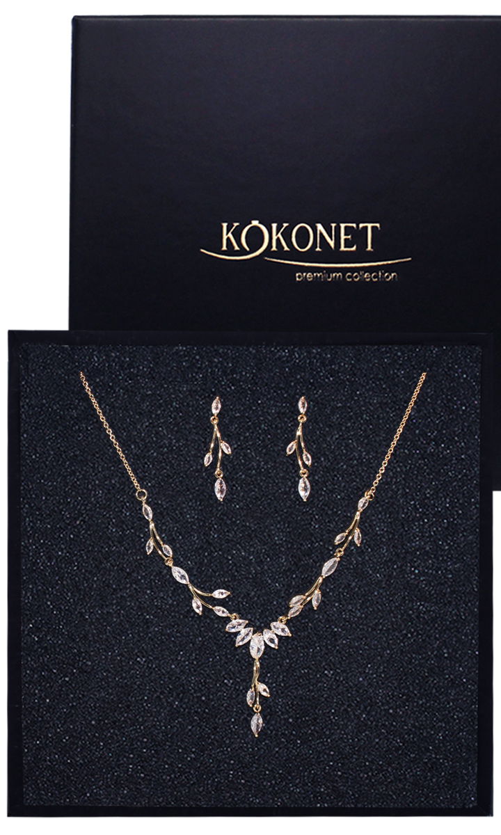 Jeśli szukasz złotego kompletu biżuterii ślubnej, która dopełni Twoją rustykalną stylizację ślubną to świetnie trafiłaś. Lekkie kaskadowe kolczyki z cyrkoniami w połączeniu z ozdobnym naszyjnikiem z listkami nada stylizacji blasku z jednoczesnym zachowaniem delikatności. Prezentowany zestaw biżuterii w postaci kolczyków i naszyjnika jest bardzo lekki i efektowny.