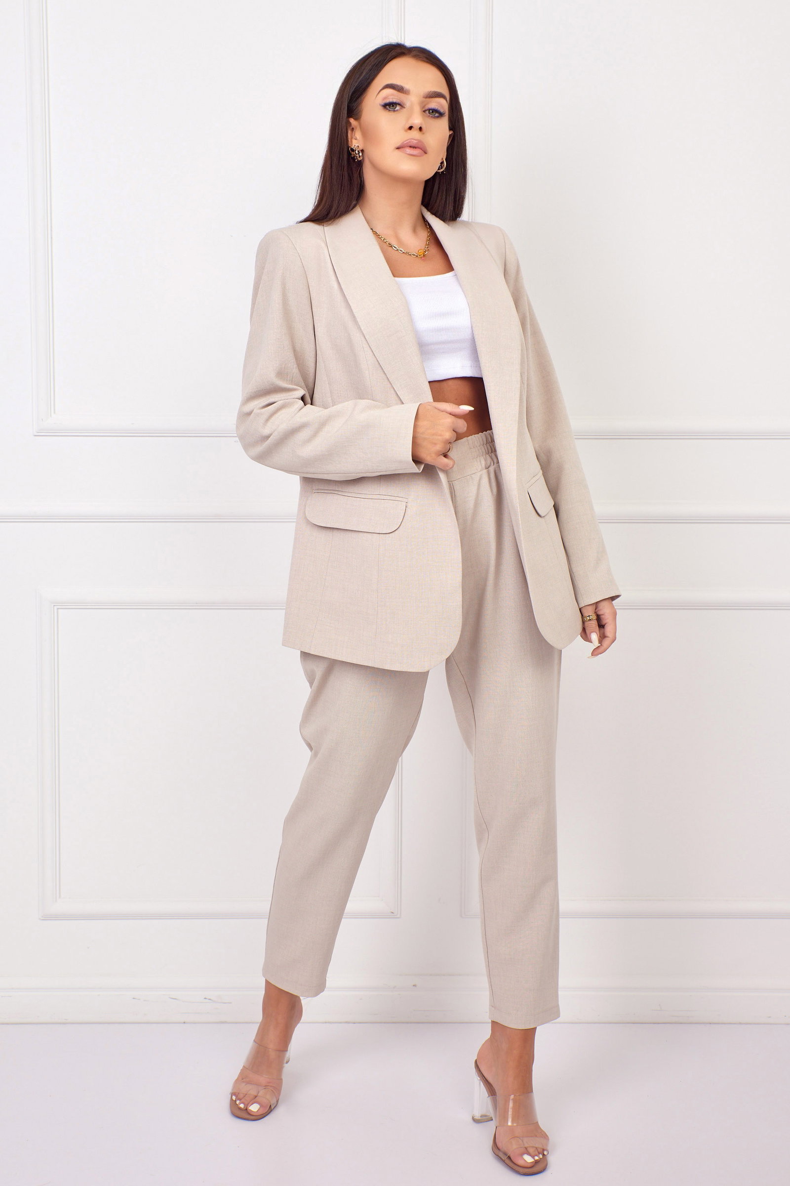 Garnitur damski uszyty z materiału który w splocie nawiązuje do lnu.