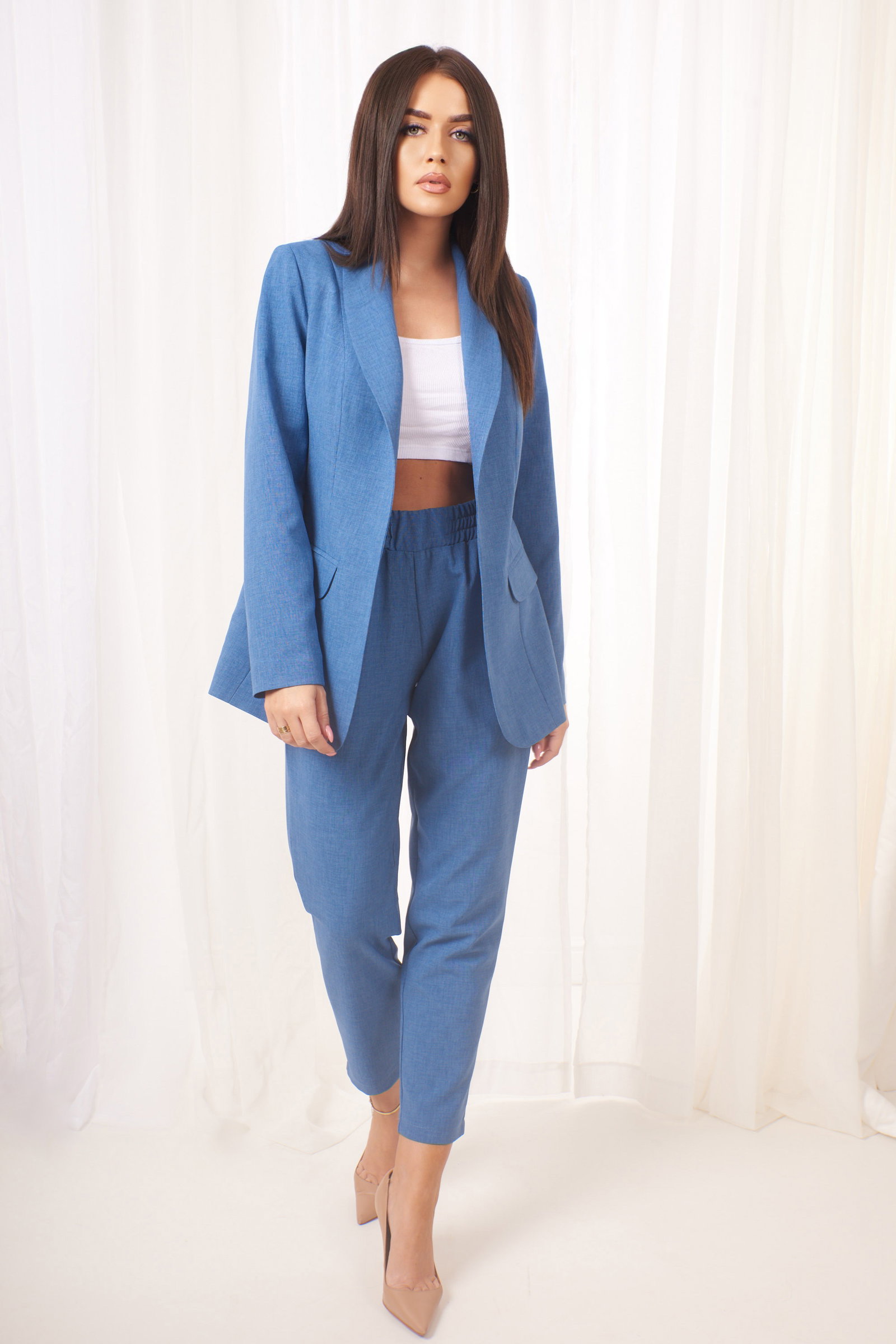 Garnitur damski uszyty z materiału który w splocie nawiązuje do lnu.