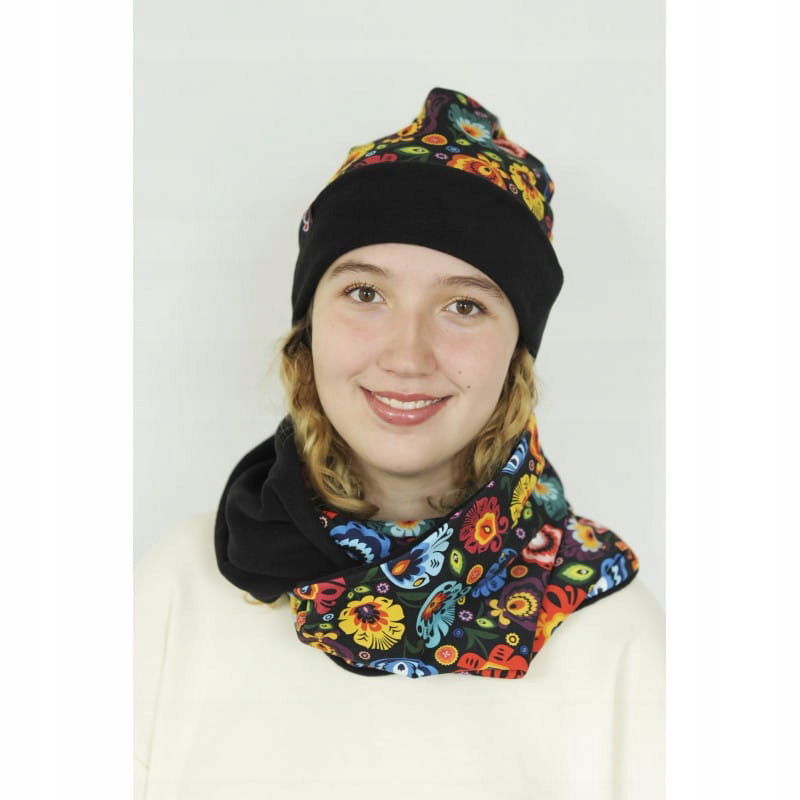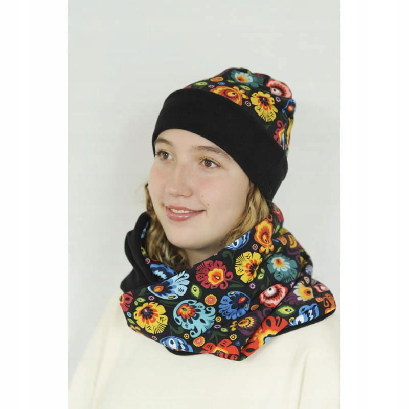 Piękny łowicki komplet na zimę składający się z czapki i komina. Czapka i komin zostały uszyte z wysokiej jakości bawełny z motywem łowickim na czarnym tle oraz mięciutkiego i ciepłego polaru w kolorze czarnym. Zestaw będzie nietuzinkowym folkowym wykończeniem zimowej stylizacji.