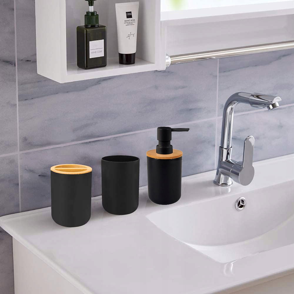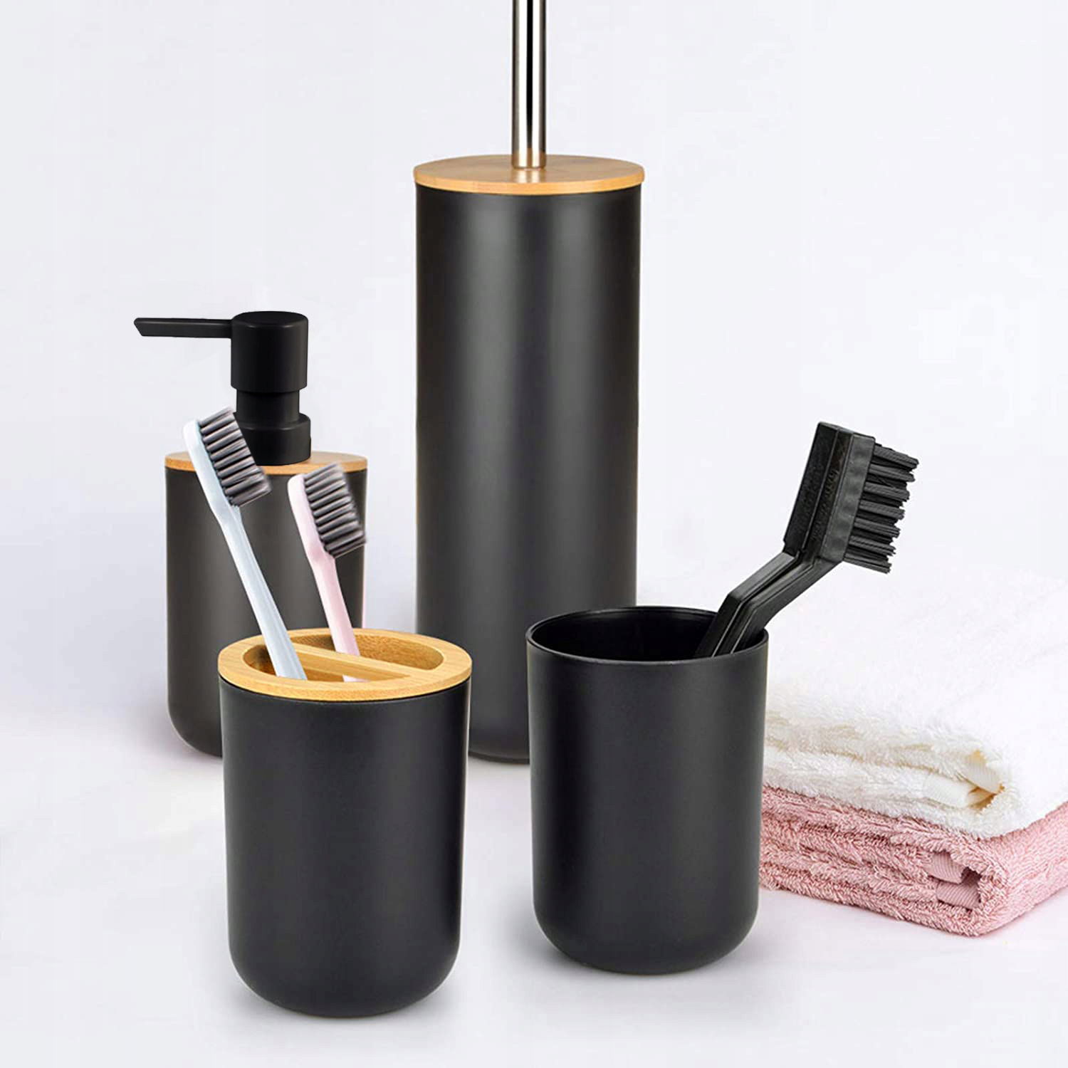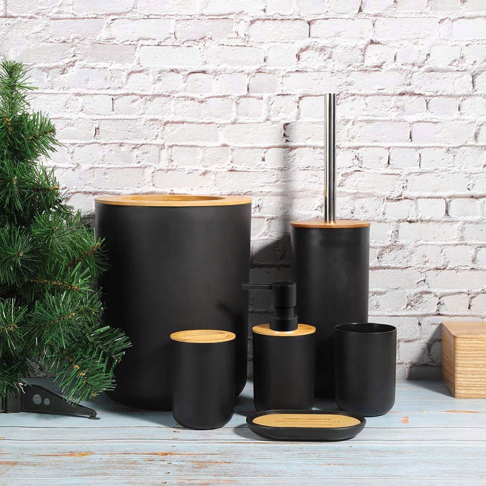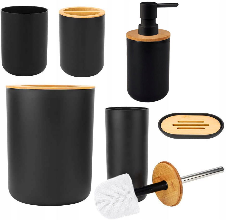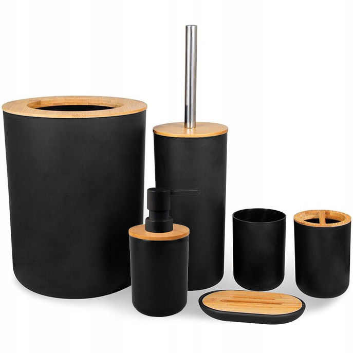 Elegancki, 6-elementowy zestaw łazienkowy, który łączy nowoczesny design z wysoką jakością wykonania. Dzięki starannemu połączeniu materiałów, takich jak czarny matowy polipropylen oraz naturalny bambus, zestaw ten idealnie wpasowuje się w aranżacje w stylu loftowym, industrialnym oraz klasycznym. Gładkie krawędzie i opływowe kształty sprawiają, że jest łatwy w utrzymaniu czystości, a minimalistyczny wygląd dodaje każdej łazience elegancji.