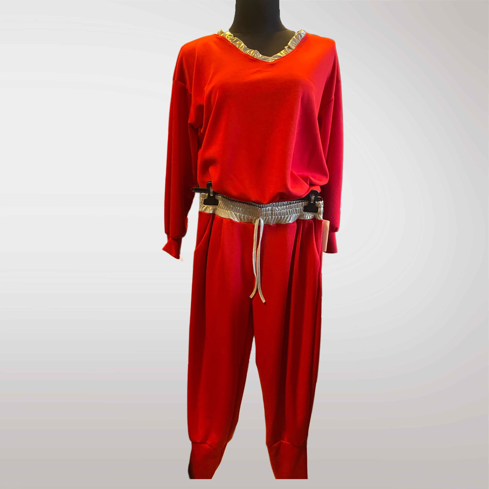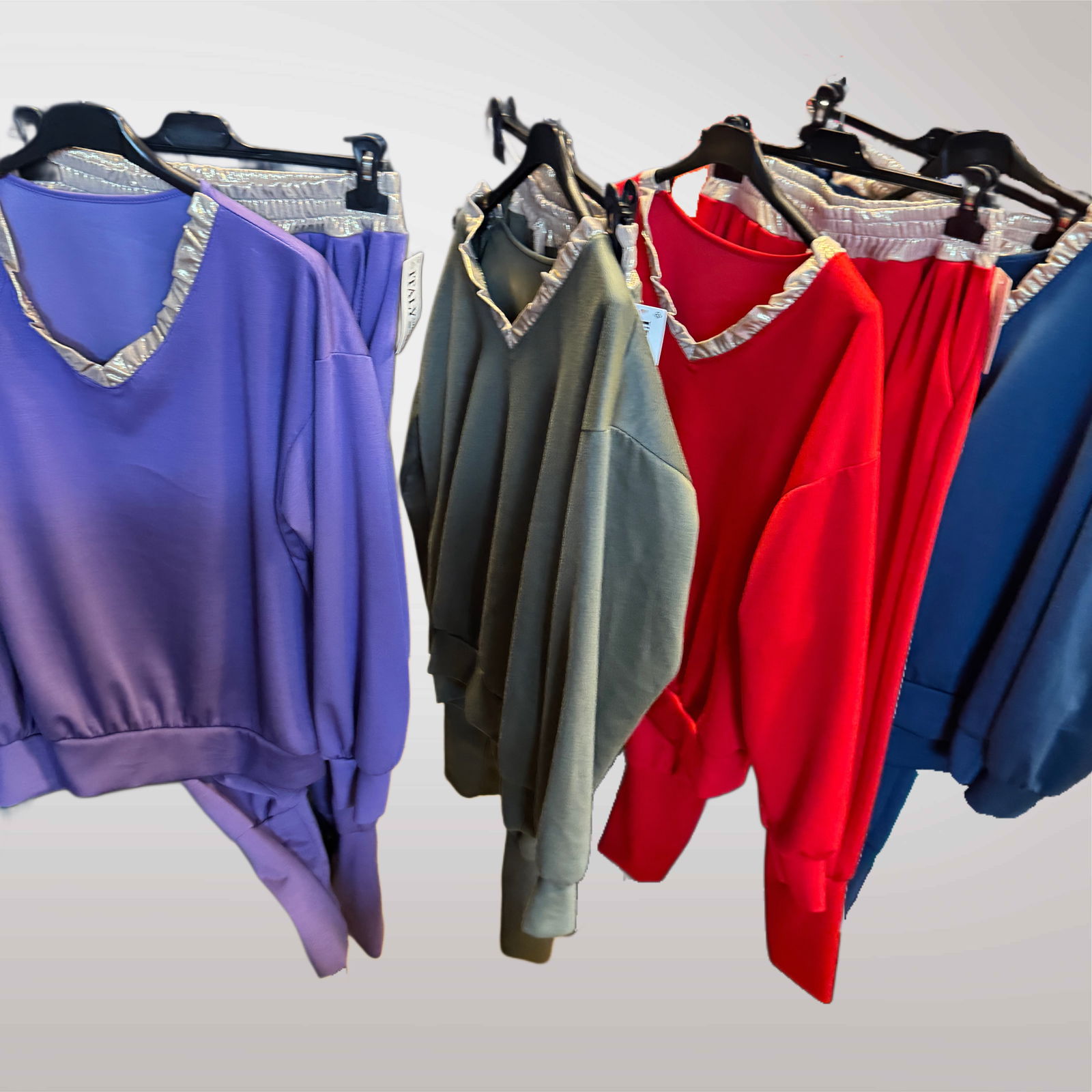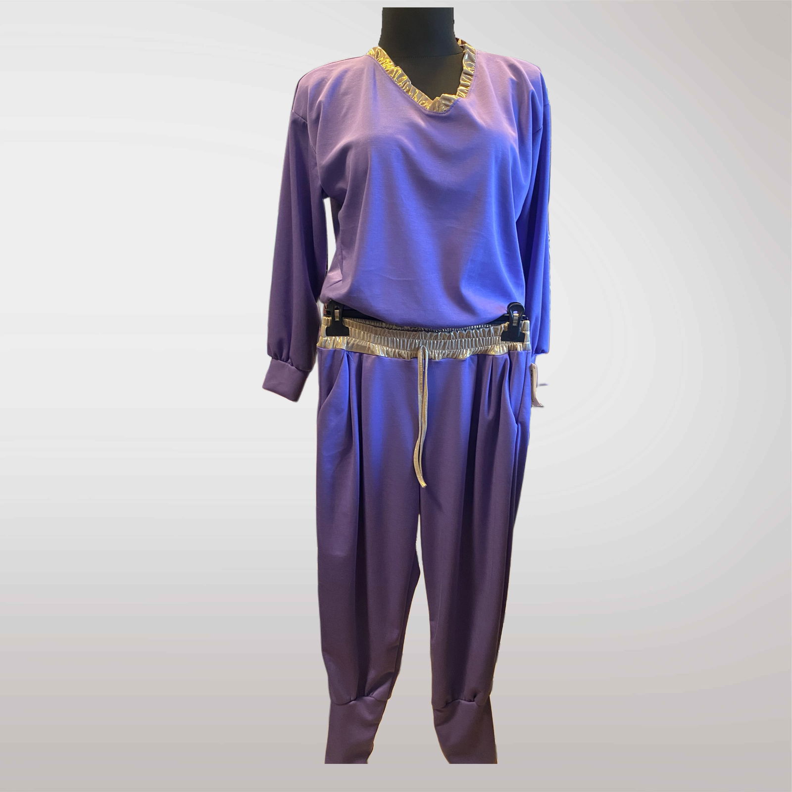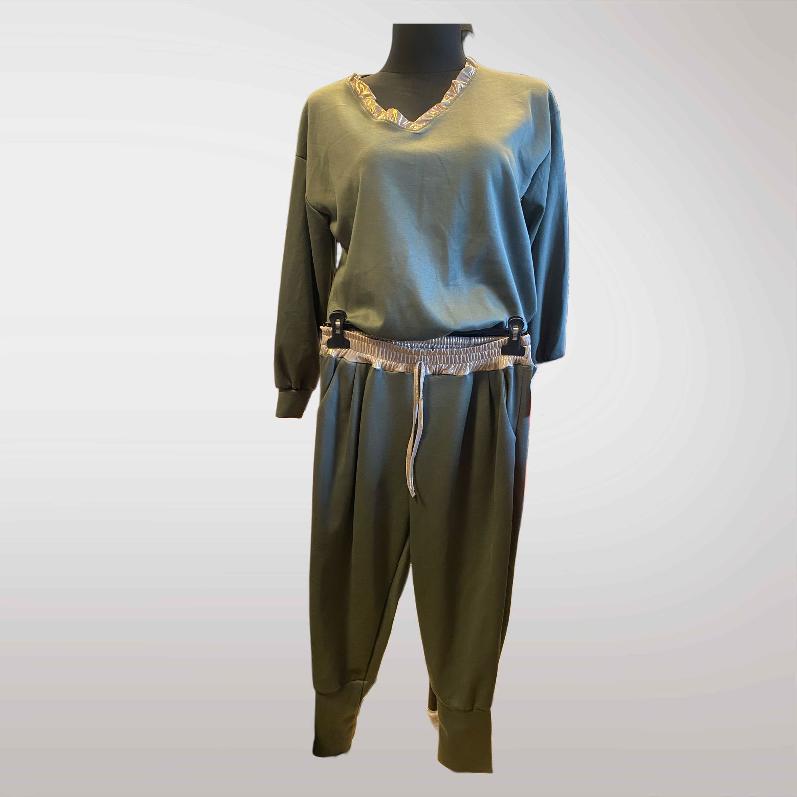 Komfortowy komplet dresowy masełko długi rękaw z ozdobnym wykończeniem przy dekolcie. Miękki, przyjemny w dotyku materiał sprawia, że świetnie nadaje się zarówno na co dzień, jak i na bardziej sportowe stylizacje.