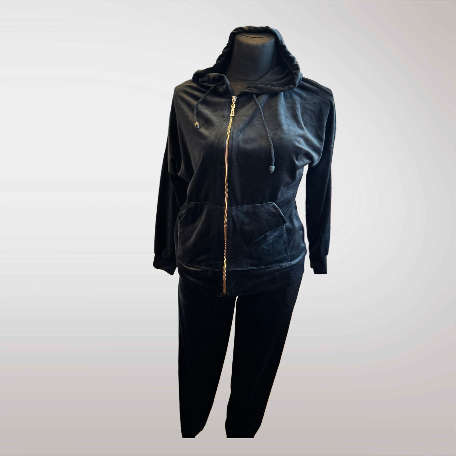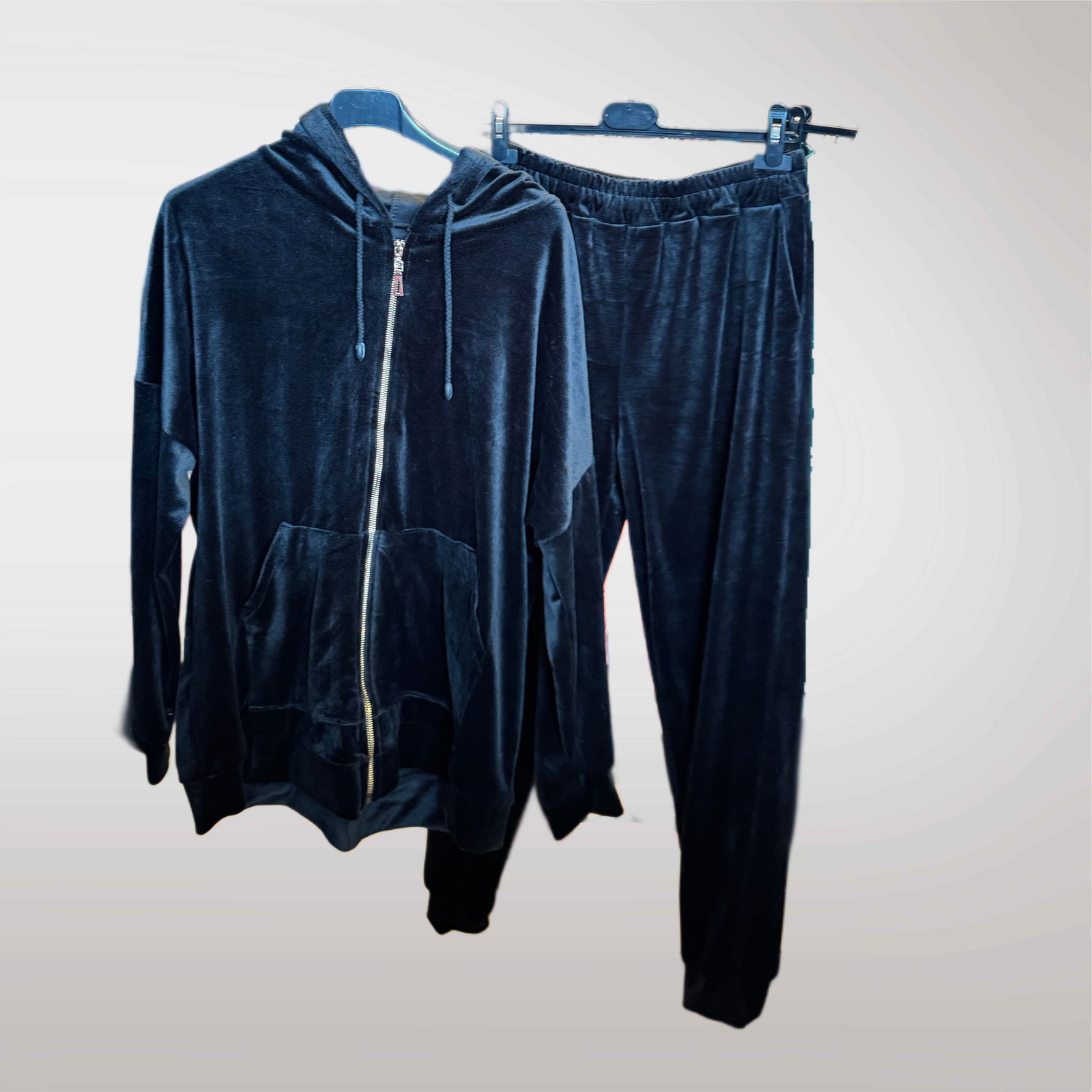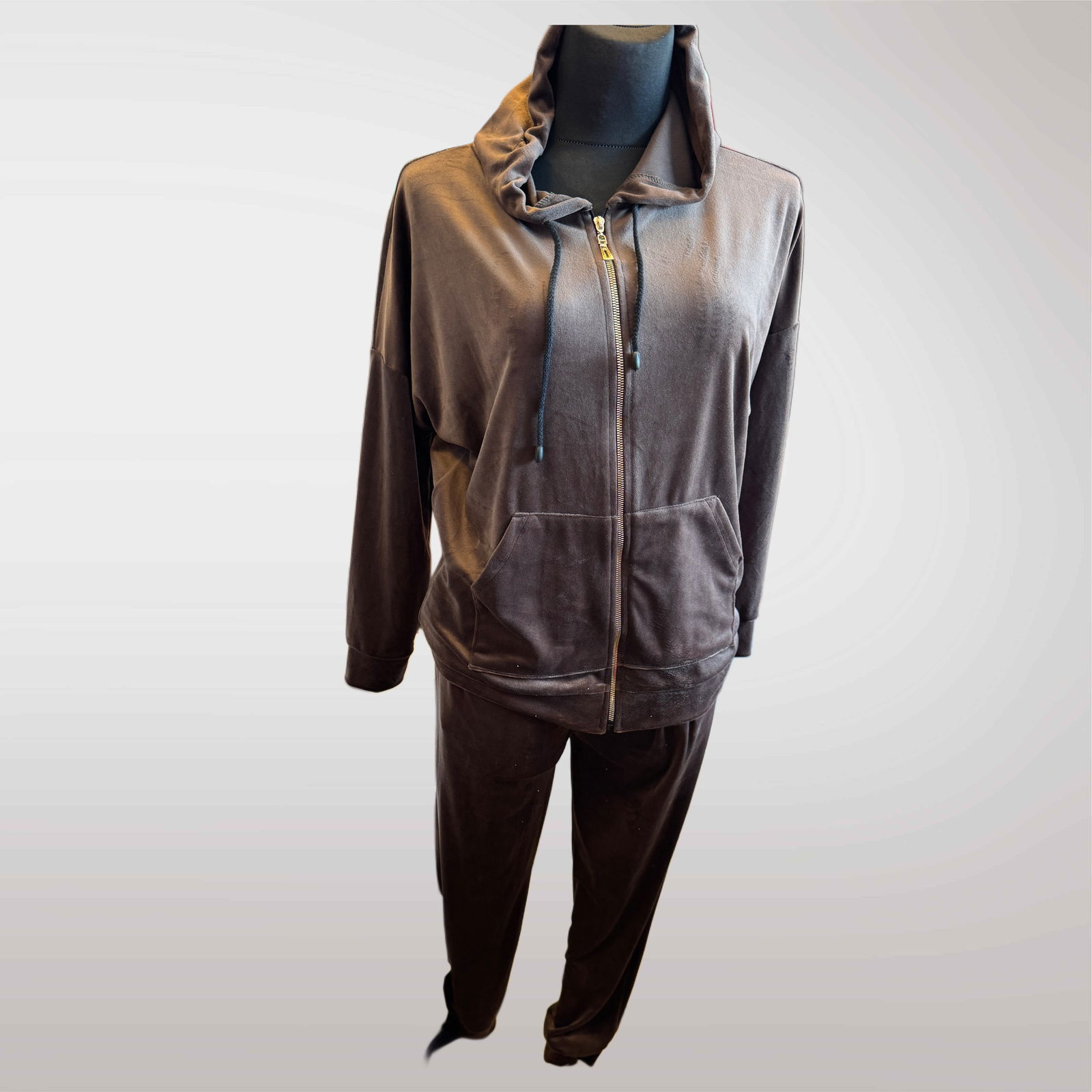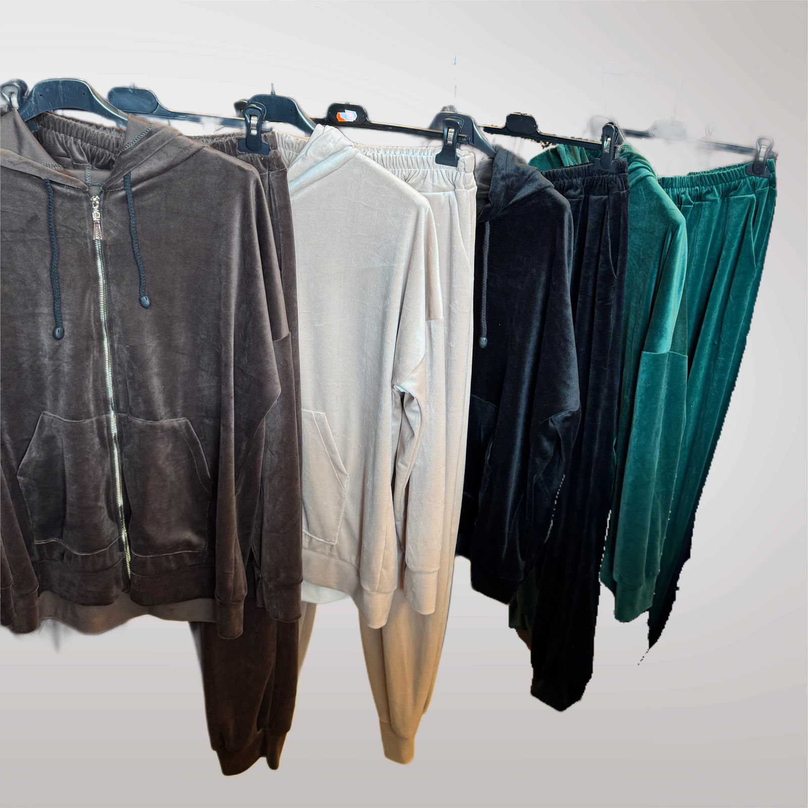Stylowy komplet dresowy wykonany z miękkiego, welurowego materiału. Luźny fason zapewnia wygodę, a klasyczny krój sprawia, że zestaw świetnie sprawdzi się na co dzień. Bluza z kapturem i praktycznym zamkiem oraz spodnie z elastycznym pasem gwarantują komfort noszenia.