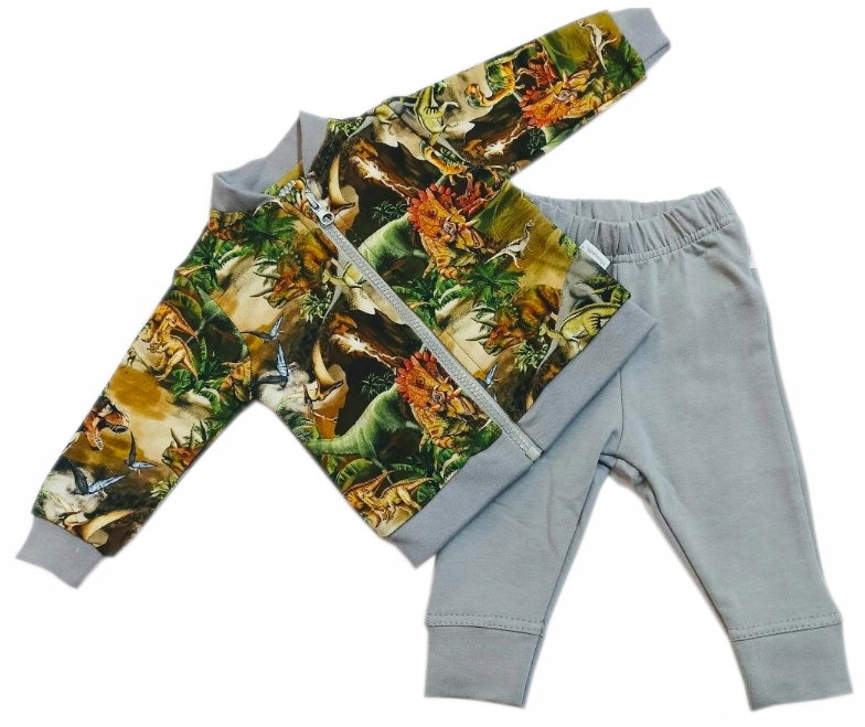 Uszyty z wysokogatunkowego, przyjemnego w dotyku materiału. Bluza z kolorowym nadrukiem dinozaurów. Zapinana na suwak. Spodenki posiadają w pasie gumę nie uciskającą brzuszka dziecka. Zarówno bluza i spodenki zakończone są miękkimi ściągaczami.