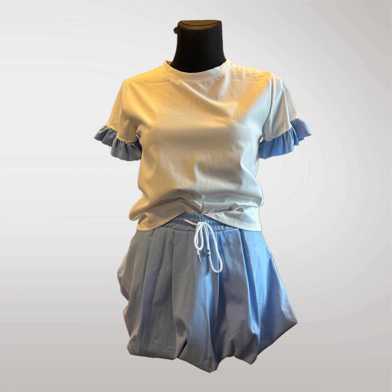 Stylowy komplet składający się z lekkiej koszulki z falbankami na rękawach oraz spódniczki typu bombka z gumką w pasie. Idealny na ciepłe dni – wygodny, przewiewny i kobiecy. Rozmiar uniwersalny – pasuje na różne sylwetki.