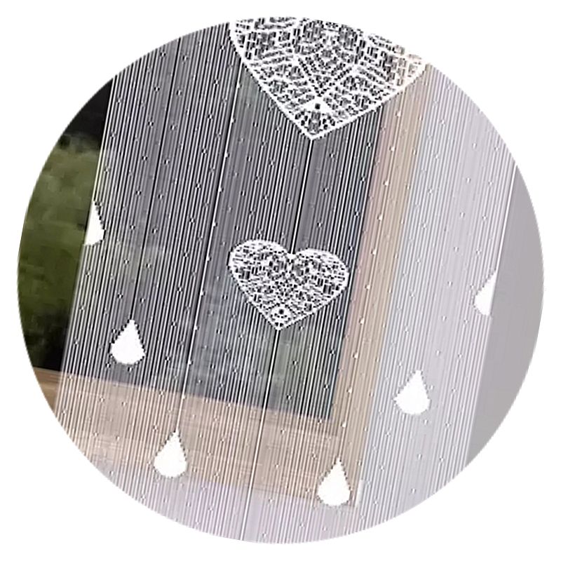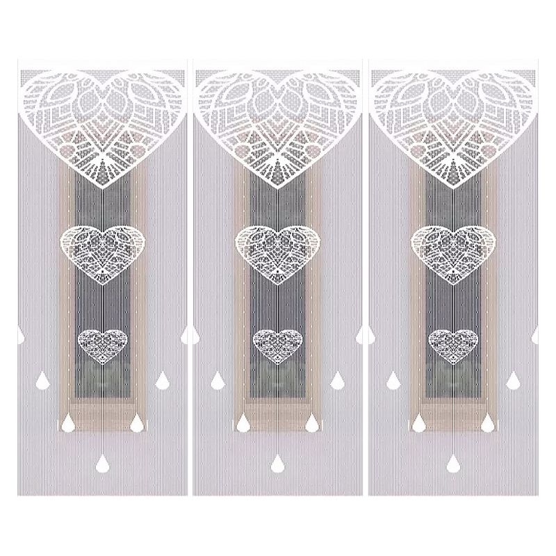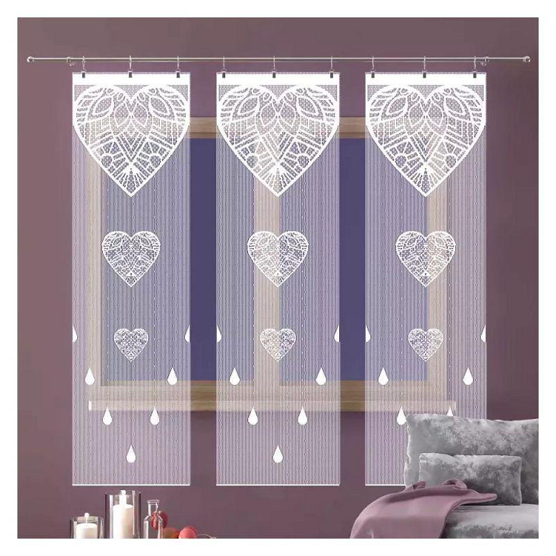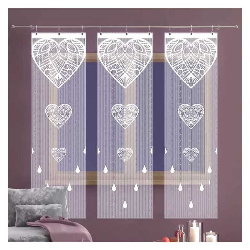Atrakcyjny wzór serc w eleganckiej białej kolorystyce sprawia, że zestaw trzech firan z frędzli sznurkowych zawieszony w Twoim oknie będzie pięknym dekoracyjnym akcentem przez wiele lat.