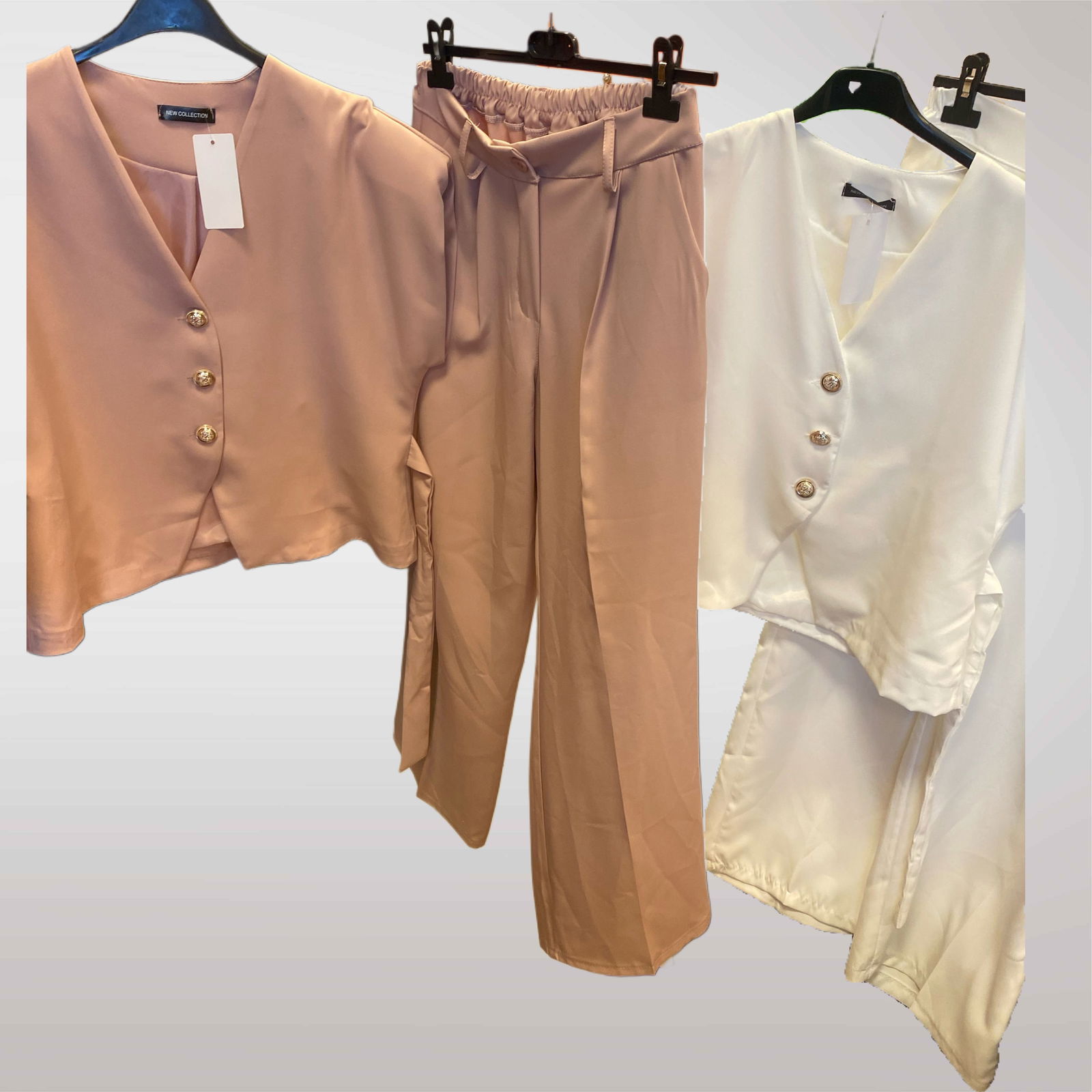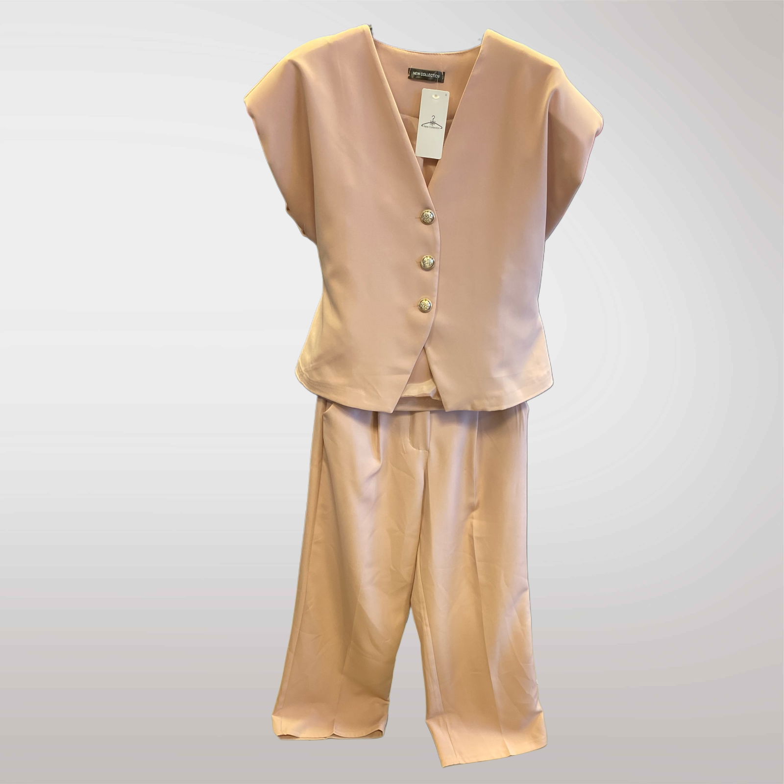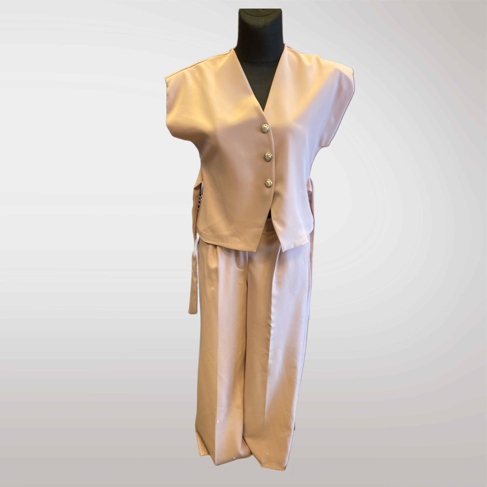 Elegancki komplet damski z krótką kamizelką – nowoczesna i stylowa propozycja na wiosnę i lato. Idealny jako garnitur na komunię, święta, chrzciny, przyjęcia rodzinne, ale też do biura lub na codzienne wyjścia. Składa się z zapinanej na guziki kamizelki z ozdobnym wiązaniem po bokach oraz luźnych spodni z elastycznym pasem. Komplet prezentuje się bardzo kobieco i elegancko, a przy tym jest wygodny w noszeniu.