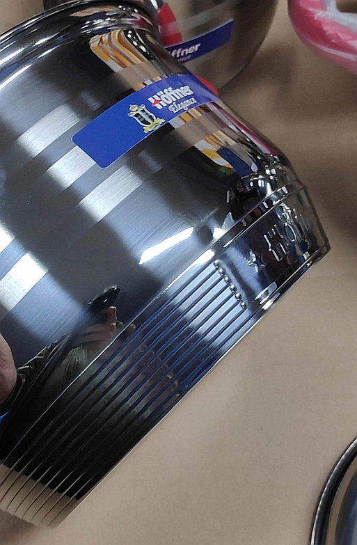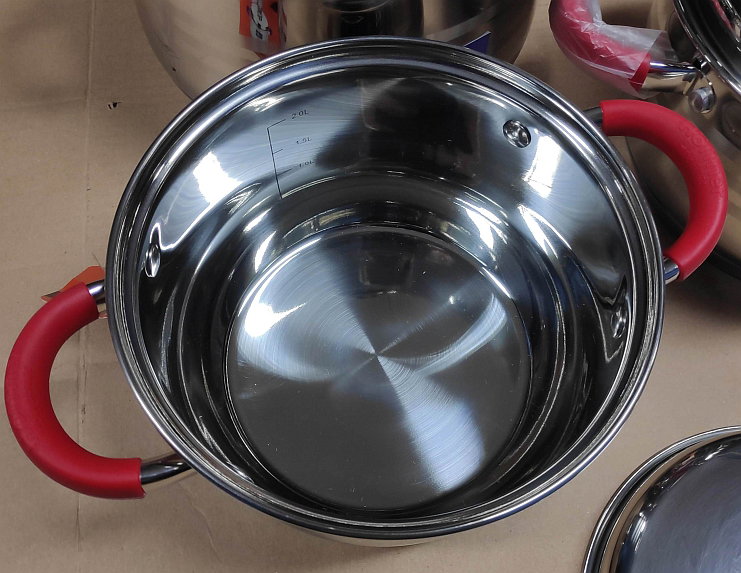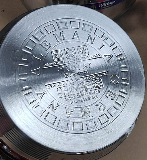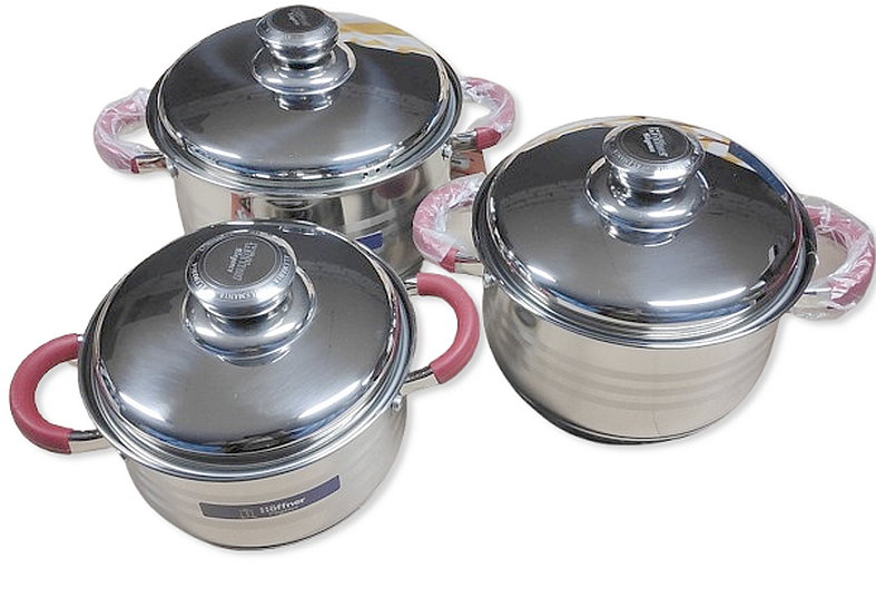 Komplet garnków Hoffner z pokrywkami stalowymi, dnem 9 warstwowym. Na wszystkie kuchenki. Garnki w komplecie 2,5L, 3,2L, 4L. Uchwyty z osłonkami żaroodpornymi w kolorze czerwonym.