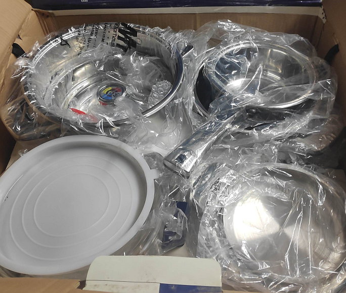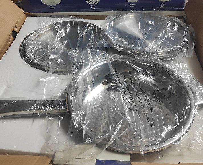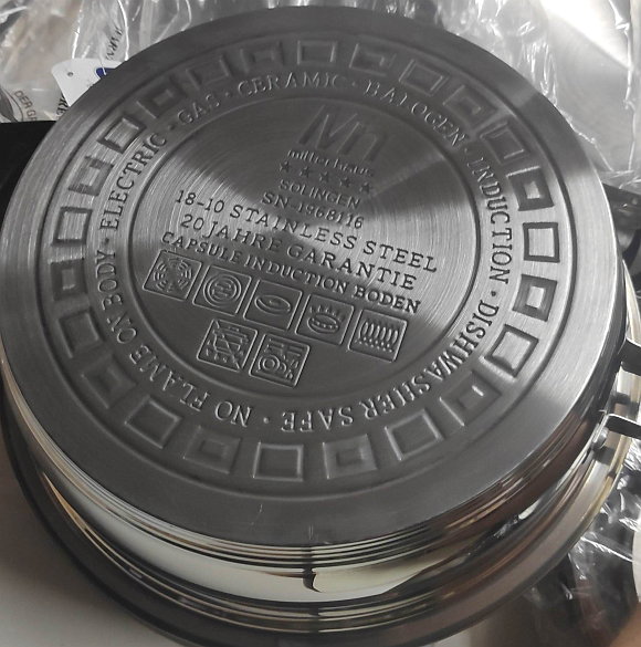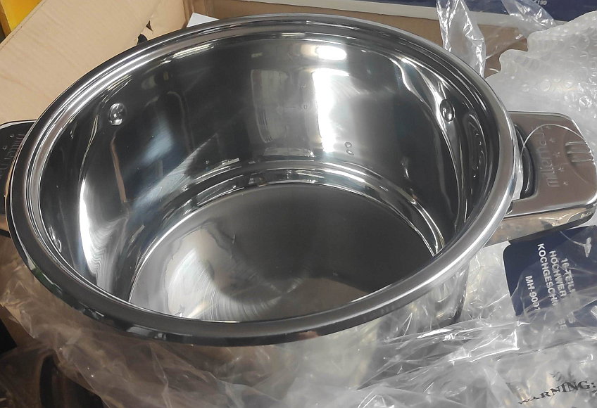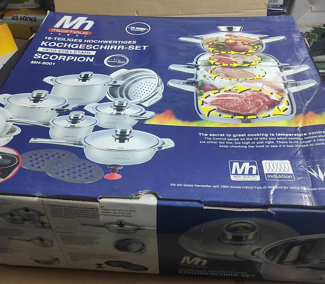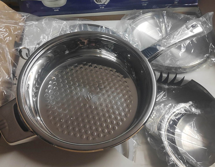 W komplecie: Garnek 24 cm 5,5 L Garnek 20 cm 3,5 L Garnek 16 cm 1,6 L Rondel 16 cm 1,6 L Patelnia 24 cm stalowa Pokrywki X5 Podkładki żaroodporne X2 Nakładka do piętrowego gotowania na parze Przyssawka Miska z pokrywą