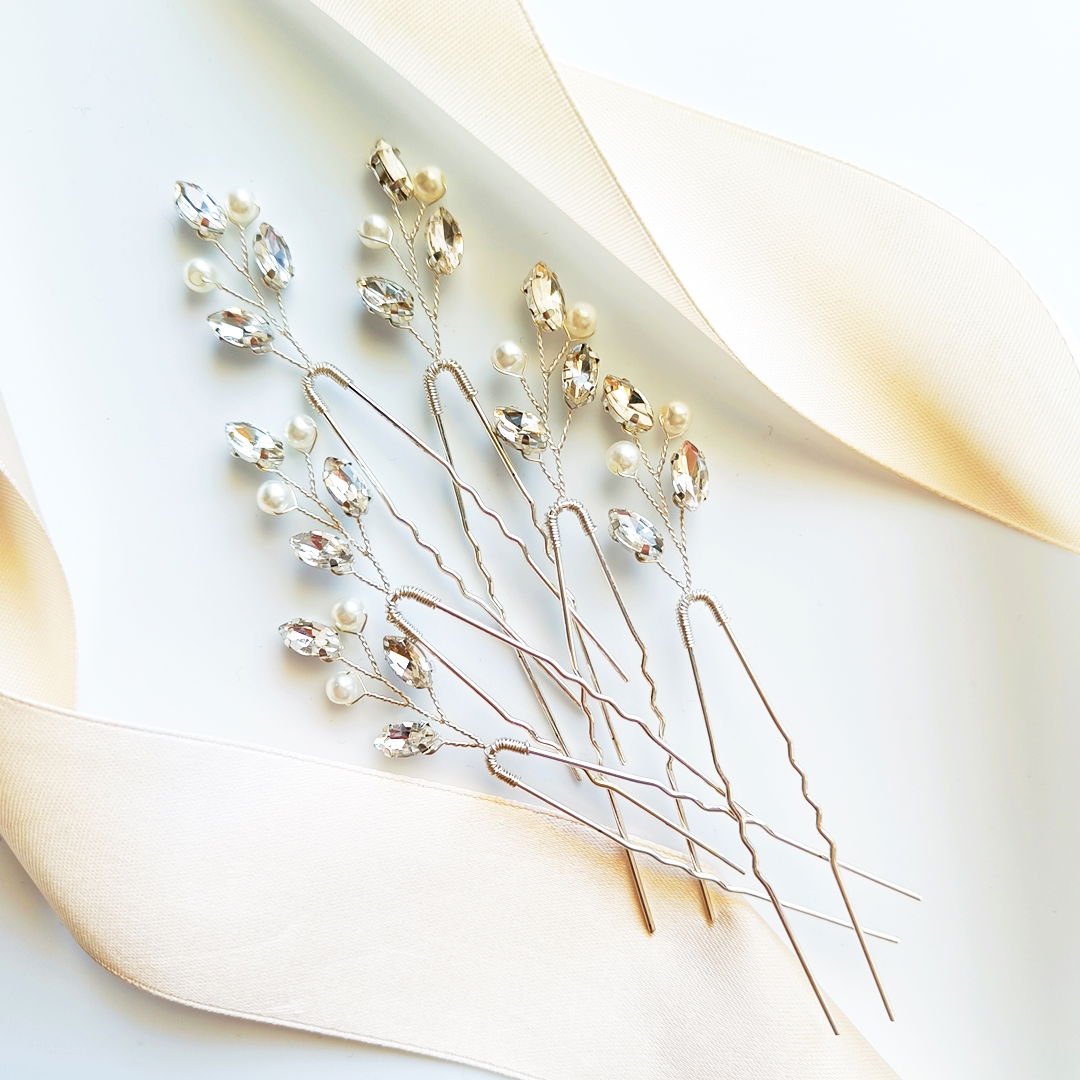 Ozdobne wsuwki do włosów w kolorze srebrnym dodadzą blasku stylizacji. Perełki urozmaicają całą kompozycję podkreślając ich klasę.