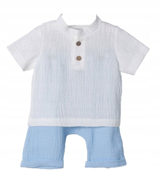 Uszyte z przyjemnego i przewiewnego materiału. Komplet muślinowy koszula ze spodenkami. Koszulka z krótkim rękawkiem, o prostym kroju. Ozdobiona dodatkowa kokosowymi guziczkami. Spodenki uszyte w podobnym stylu, z wygodną gumką w pasie także ozdobione guzikami. Całość zestawu stanowi wyjątkowy i wygodny komplet.