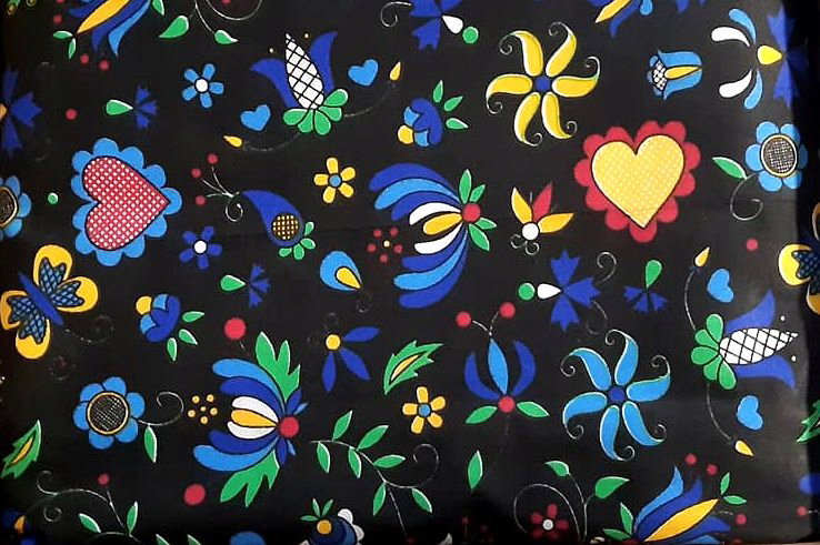 Komplet pościeli na czarnym tle z kaszubskim wzorem haftów uszyty z bawełny. Jest miękki i delikatny w dotyku, w pełni oddychający i przyjazny dla ciała oraz zapewnia przyjemny, spokojny i komfortowy sen. Swobodną cyrkulację gwarantuje wysoka struktura włókien, która zapewnia zimą ciepło, a latem poczucie chłodu. Starannie ukryty zamek błyskawiczny, pozwala łatwo zapiąć poszewki.
